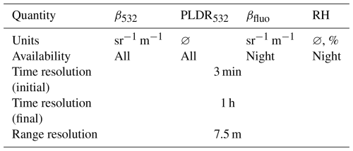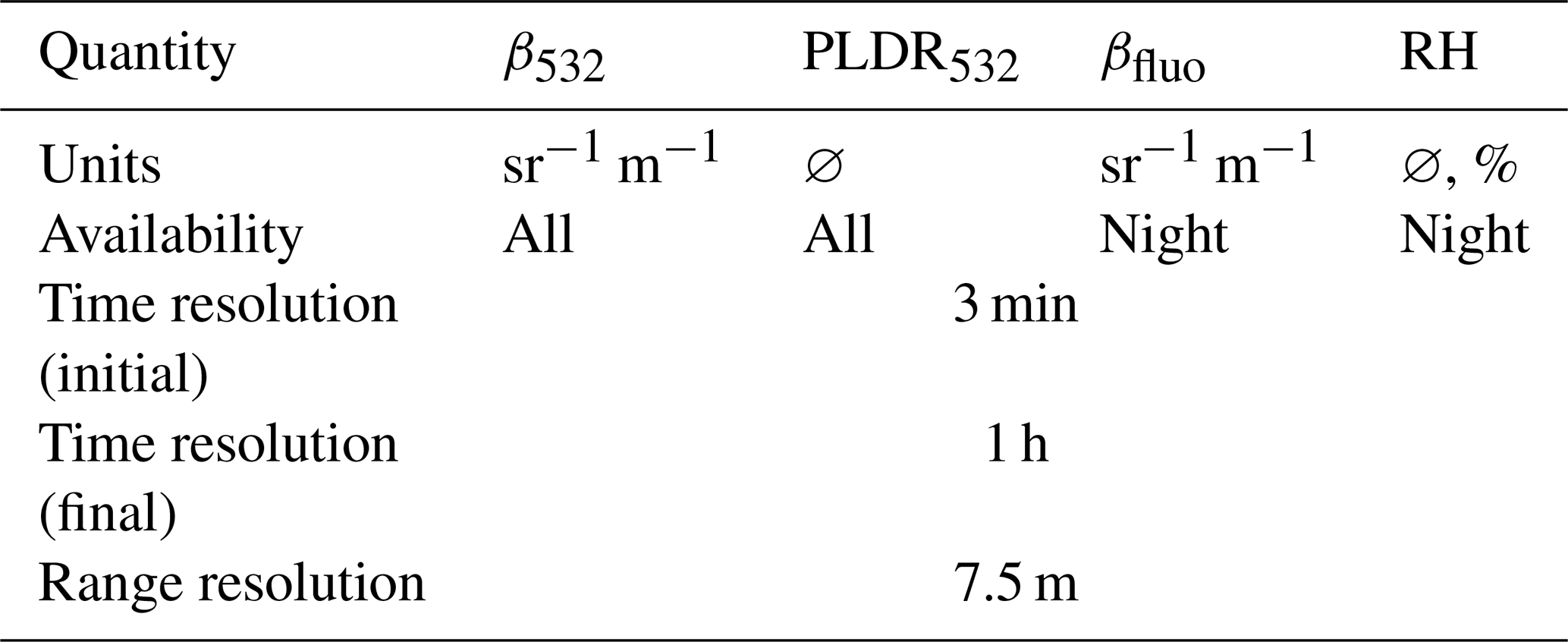 The gathered lidar profiles are inverted using the modified Raman inversion method (Ansmann et al., 1992; Veselovskii et al., 2022) used to obtain quick looks of the elastic backscatter coefficient (βλ) and the particular linear depolarization ratio (PLDR) of the aerosols at 532 nm, as well as the fluorescence backscatter coefficient (βfluo) of the aerosols and the water vapor mixing ratio, with a high temporal and vertical resolution (about 3 min and 7.5 m, respectively). In order to maximize the signal-to-noise ratio, the quick looks are averaged over a period of 1 h. Only nighttime measurements have been considered for this study because of the low intensity of fluorescence and water vapor Raman signals, which makes it difficult to obtain accurate daytime measurements. In order to calibrate the water vapor mixing ratio measured by the lidar, the method developed by Foth et al. (2015) is used with an RPG-HATPRO microwave radiometer and temperature data obtained from the ERA-5 reanalysis model. The lidar water vapor mixing ratio calibration procedure is described in Miri et al. (2024). From this calibrated measurement and with the ERA-5 temperature, the atmospheric relative humidity (RH) is computed.