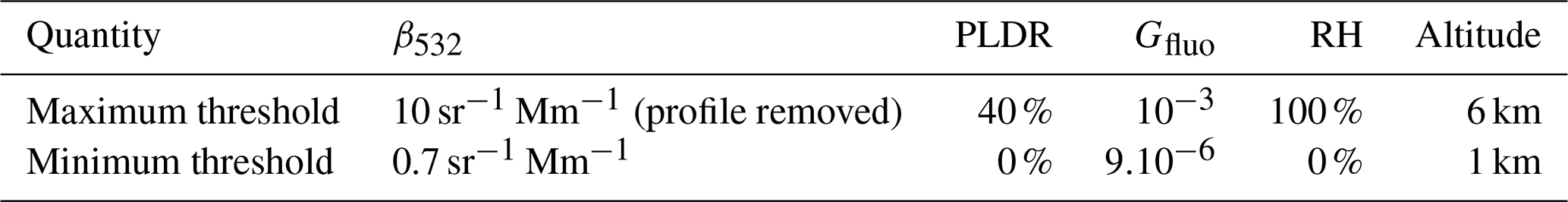 Regarding Gfluo, the results from Veselovskii et al. (2022) and the observation of the LILAS data have been used to determine the various thresholds to filter outliers. In the dataset used for this study, smoke aerosols can have Gfluo reaching up to 10−3. This value has thus been chosen as the upper threshold for Gfluo, and cases exhibiting higher values have been filtered out. For the lower threshold, a value of 9.10−6 has been selected. This choice has been motivated by observations of Gfluo of urban and dust cases, which rarely fall below this threshold. Lower values of Gfluo are typically observed only in clouds. This lower threshold is thus a secondary filtering process enabling the exclusion of such conditions.