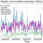 A strong variability can be seen in both the simulated and measured Aitken subranges at the German sites (Melpitz and Leipzig), although the peaks and troughs match poorly. In winter, the simulated concentrations decrease more than they should. The downscaling methods are generally able to bring the concentrations to a more realistic level, but they fail to capture the true variability in the data. Compared to the subranges simulated by ECHAM-HAMMOZ, the downscaled concentrations no longer fluctuate as rapidly, but instead seem to more carefully follow an average level between the peaks and troughs of the measured time series. This can be acceptable when the main focus of a study is on long-term averages, and not on e.g. maximum daily exposures. Regardless, an improvement compared to the original is seen in all reported metrics. For the Aitken subrange from Helsinki, the original simulated concentration is mostly too low, and has a less drastic summertime variability compared to the German sites. The downscaling by XGBoost fixes the underestimation and brings the variability closer to that of the measurements. Based on the metrics, the results are quite similar to the other Aitken subrange datasets. The increase in the correlation coefficient from 0.12 to 0.53 is largest out of all datasets, and the improvements in sMAE and ρ2 are also among the largest.