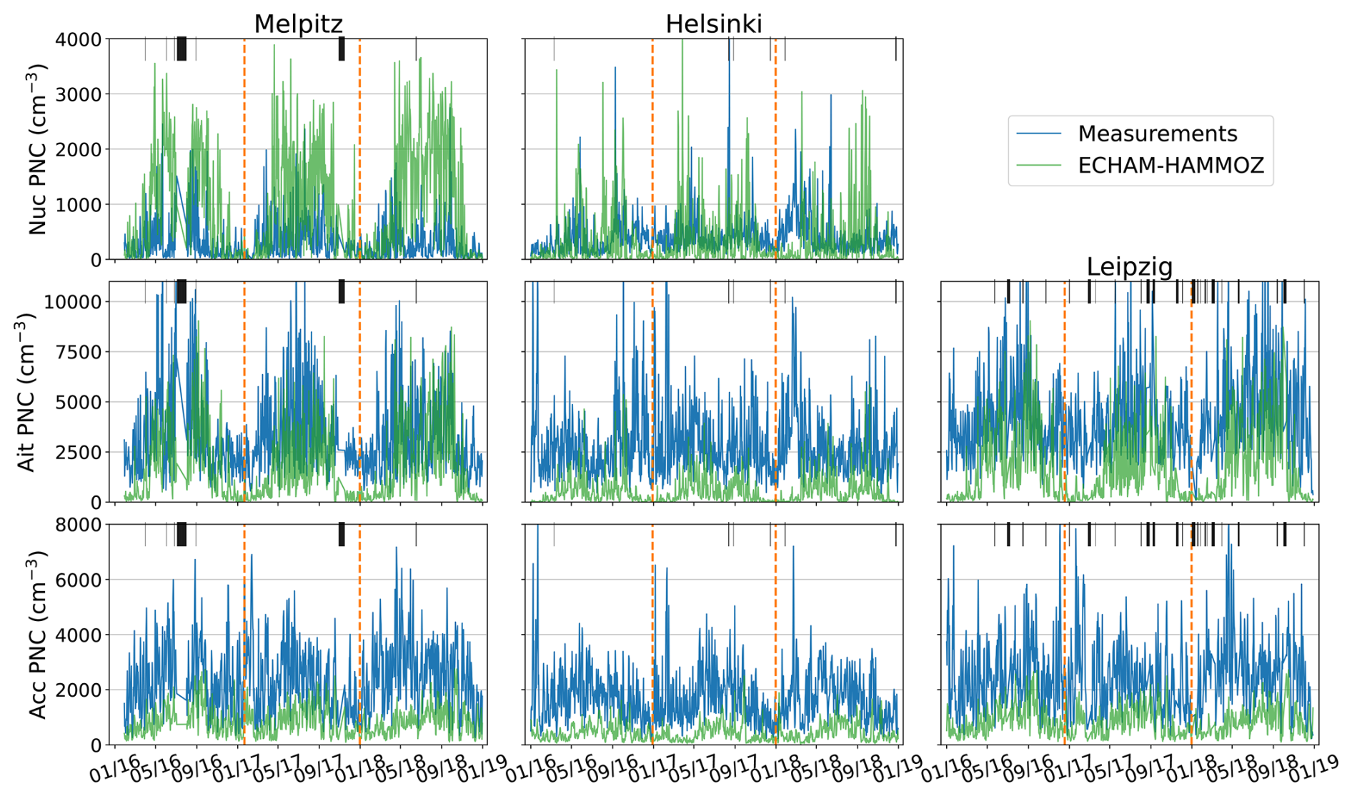 Measurement data used in this study consist of atmospheric measurements from three stations (Fig. 1), spanning years 2016–2018. Specifically, particle number size distribution data measured with the DMPS/SMPS (Differential/Scanning Mobility Particle Sizer) instruments were obtained from the stations. The data are openly available from SmartSMEAR (SmartSMEAR, 2025; Junninen et al., 2009, Helsinki) and EBAS databases (EBAS, 2025, Leipzig and Melpitz). These sites were chosen because of the relatively long and continuous time series of aerosol size distributions available. In this section, we focus on providing short descriptions of the stations' locations and regional representativeness, relevant for interpreting the results. More detailed information about the measuring stations can be found in the references of their short descriptions in the paragraphs below.