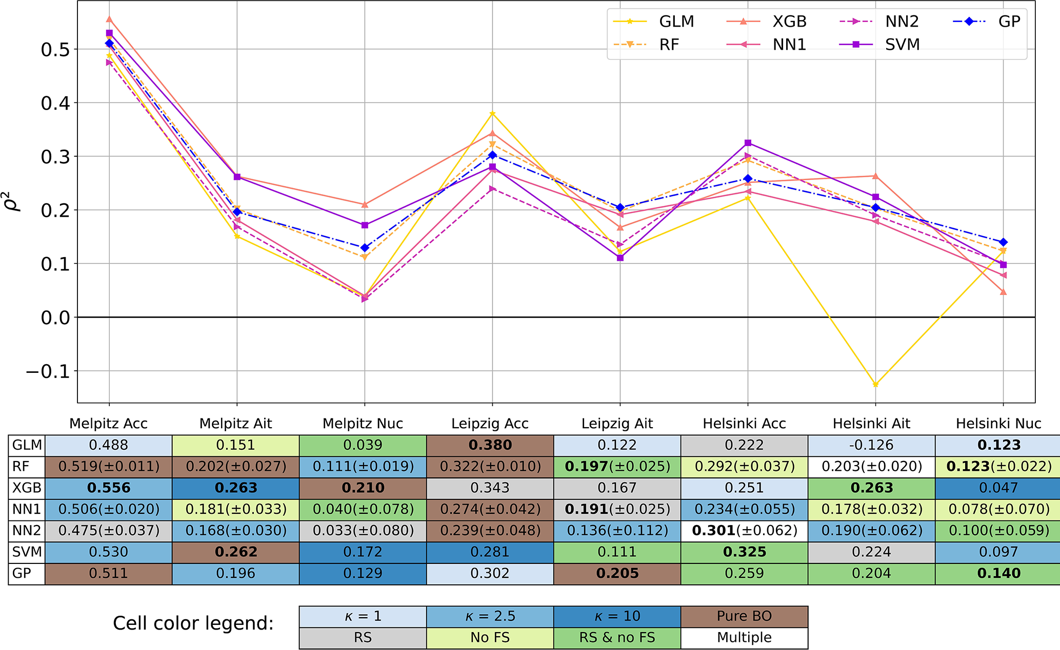 Figure 3Test set performances (ρ2) of the optimized models for all eight datasets. For the methods that are affected by randomness, the 2σ confidence intervals computed from 50 different initializations are also shown in the table. The background colors in the table represent the optimization method used. The methods and the abbreviations are explained in Sect. 4.5.1 and 4.5.2. In the cases where multiple optimization methods produced the exact same result, the background is left blank. These cases were Helsinki Ait (Pure BO, κ=1, and κ=2.5) and Helsinki Acc (κ=1, κ=2.5, κ=10, and RS). The downscaling method(s) that achieved the highest ρ2 for a given dataset are shown in bold (differences of less than 0.025 are disregarded).