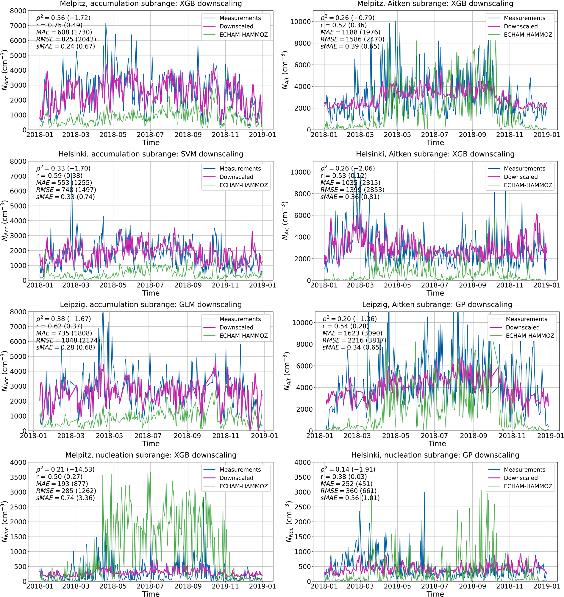 Figure 4 shows the PNC results of the most successful downscaling methods for the test subset (2018) of each of the eight datasets. In all cases, a clear improvement is observed compared to the original subranges simulated by ECHAM-HAMMOZ, both visually and based on the five metrics shown in the figures. XGBoost achieved the highest ρ2 for all subranges from Melpitz and the Aitken subrange from Helsinki. Gaussian process regression resulted in the best model for Leipzig's Aitken subrange and Helsinki's nucleation subrange, support vector machine for Helsinki's accumulation subrange, and the generalized linear model for Leipzig's accumulation subrange. Generally, the downscaling of the accumulation subrange was most successful, whereas the nucleation subrange seems to have been more difficult to downscale, resulting in relatively low ρ2s in both Helsinki and Melpitz. All three downscaled accumulation subranges have higher ρ2s, correlations, and sMAEs than any of the other datasets, even though many peaks and troughs are still estimated incorrectly. The downscaling model trained on the accumulation subrange of Melpitz performs best out of the three, producing a ρ2 of 0.56 and sMAE of 0.24.