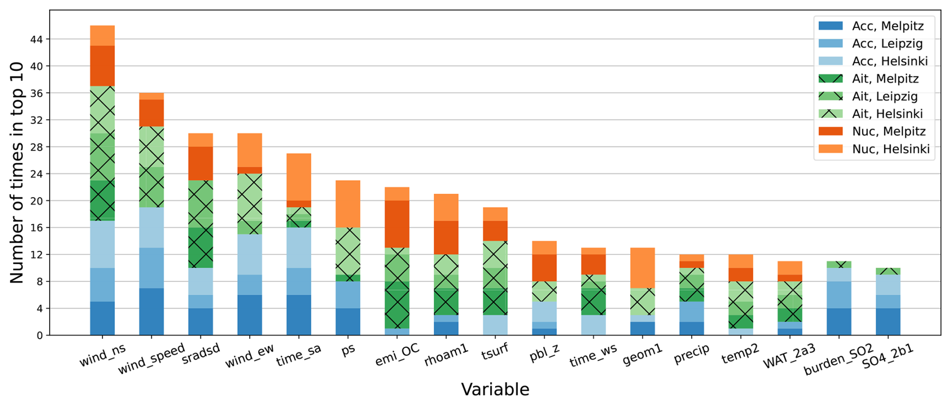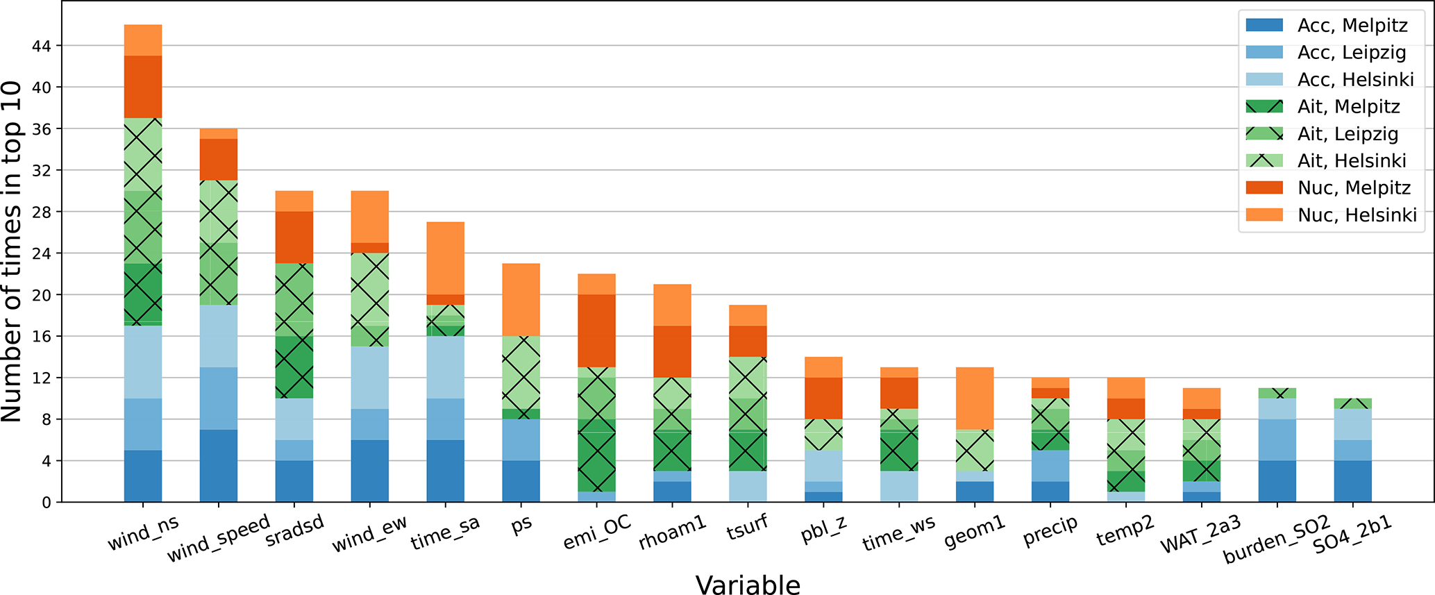 The SHAP method, described in Sect. 4.6, was used to analyze the features in the ML models. Figure 5 shows a summary of the most important features across all models. The height of the bars relates to how many models were strongly influenced by the corresponding feature, defined by the feature being among the ten highest when ranked by mean absolute SHAP value. For example, the north-south directional component of wind was among the ten most important in 46 models out of the total 56. In general, the wind-related features are seen to be important for the prediction of all subranges of the size distribution, though less so for the nucleation subrange. Solar radiation is also one of the most important variables. ML models for the smallest two size ranges seem to utilize emissions of organic carbon, whereas accumulation subrange is connected to sulfur dioxide (SO2) and sulfate (SO4), according to the SHAP values. Interestingly, the feature for geopotential height is mainly used by the Helsinki models.