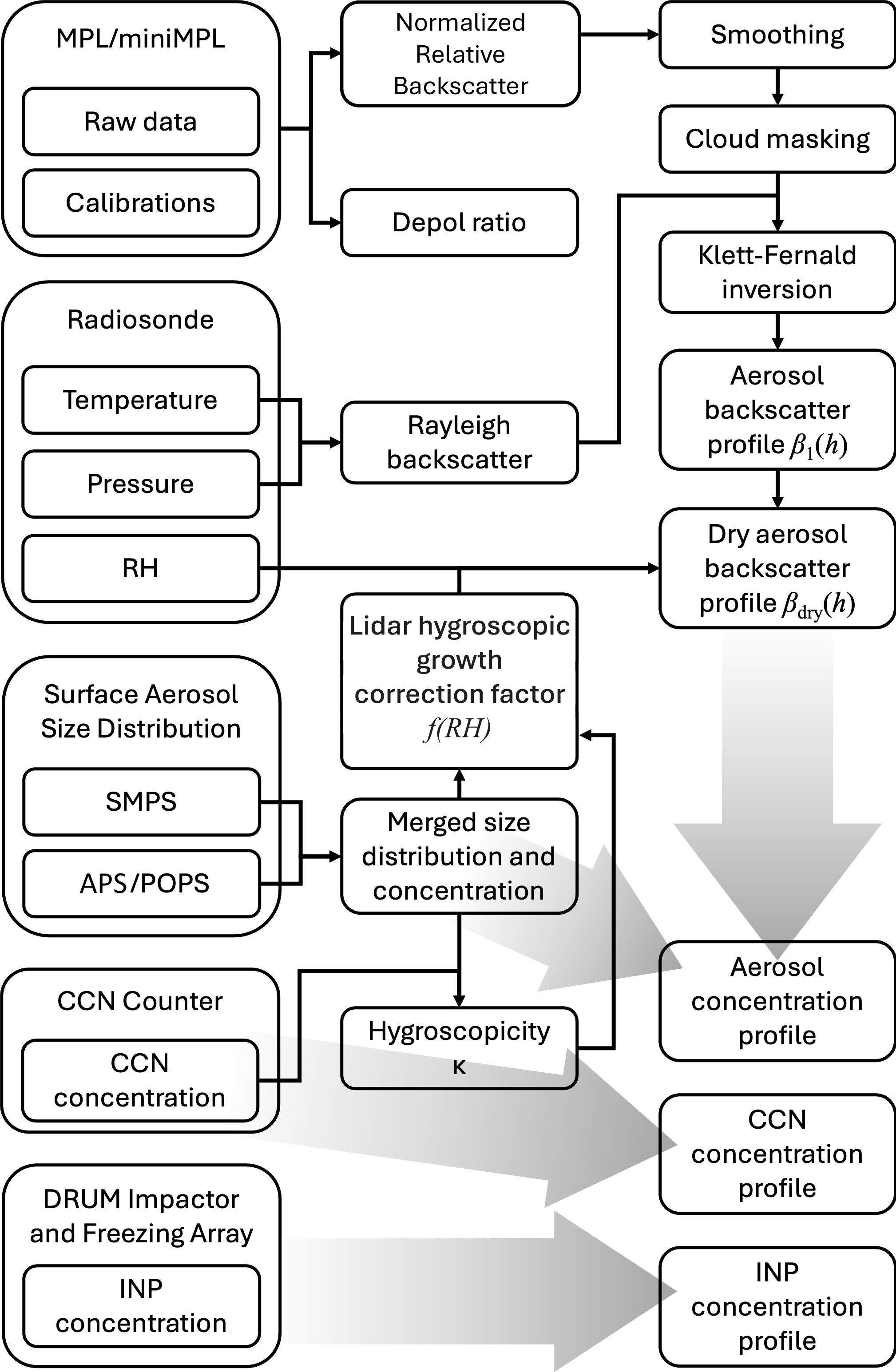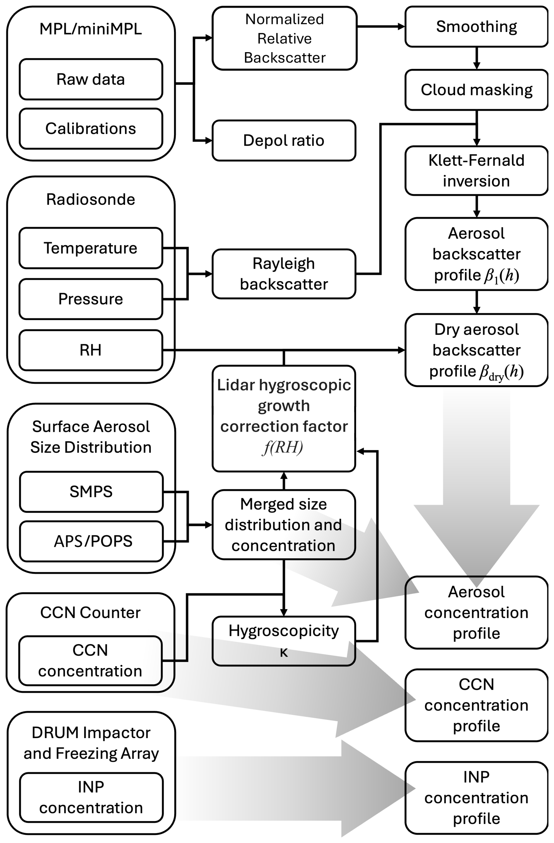 In conclusion, the integration of MPL and ground-based aerosol measurements offers a powerful tool for retrieving detailed vertical profiles of aerosols, CCN, and INPs. The retrieved profiles can serve as inputs to provide realistic aerosol vertical distributions for cloud-resolving models, facilitating the study of aerosol-cloud interactions and aerosol effects on climate.
