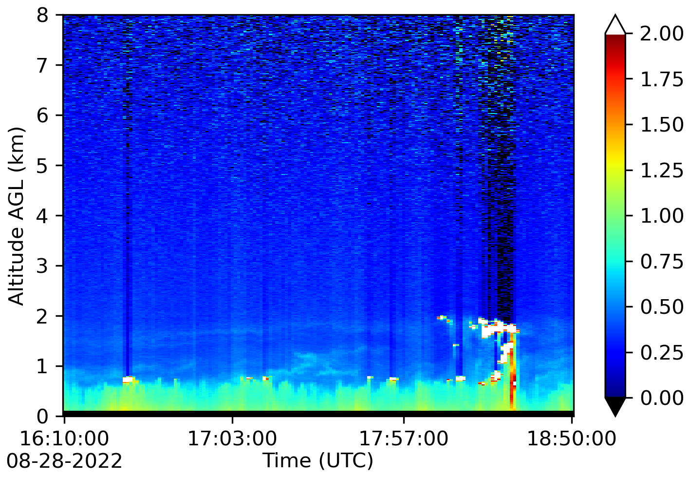Figure 3Normalized relative backscatter (NRB) time series collected on 28 August 2022, with miniMPL in Galveston, Texas.