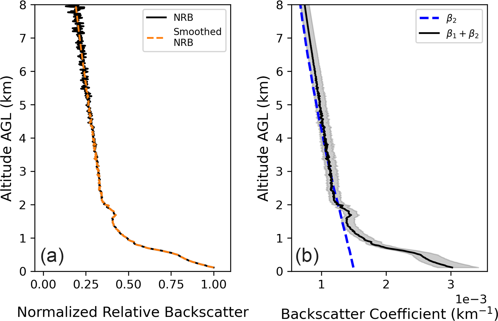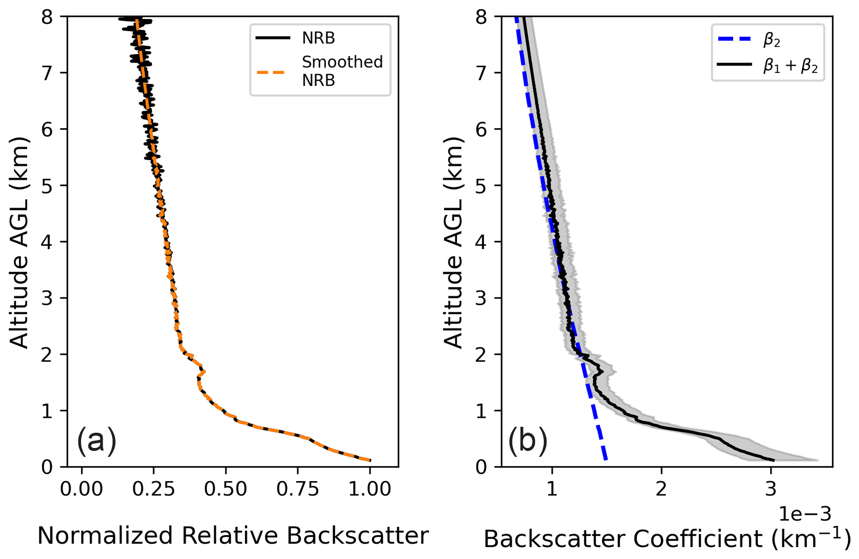 Figure 4(a) Time-averaged NRB profile of miniMPL from 16:10 to 18:50 UTC on 28 August 2022. The black line is the NRB profile normalized by the lowest level value; the orange dashed line represents the smoothed NRB. (b) Rayleigh backscatter coefficient β2 (dashed blue line) and total backscatter coefficient β1+β2 (solid black line). The shaded region shows the uncertainty range of the retrieved total backscatter coefficient.