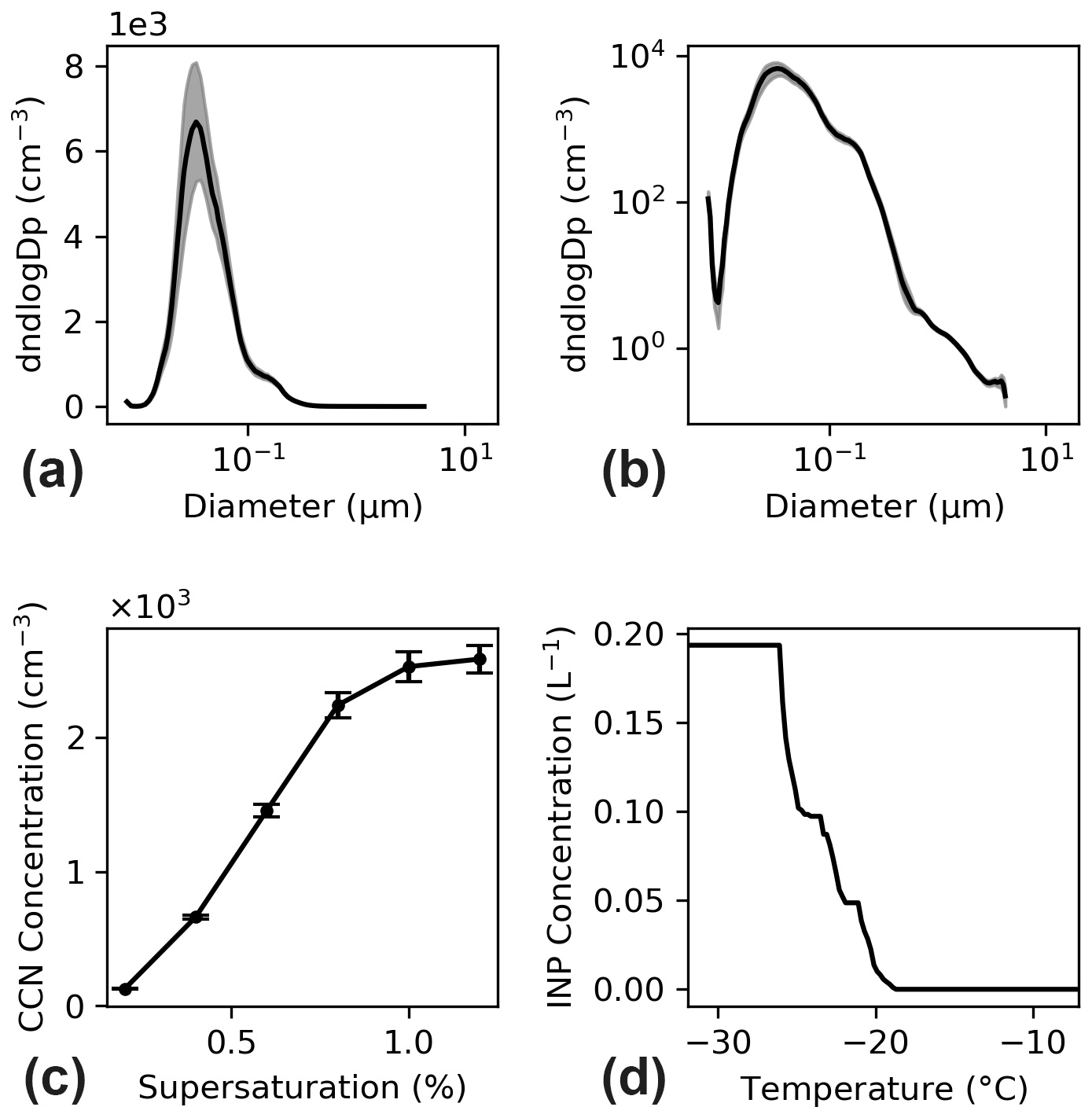 Figure 5Time-averaged aerosol measurements were collected on 28 August 2022, from 16:10 to 18:50 UTC at the TAMU site in Galveston. (a) Time-averaged aerosol size distribution with a y-axis on a linear scale. The shaded area illustrates the standard error of the estimated mean. (b) Time-averaged aerosol size distribution with a y-axis on a log scale. (c) CCN spectra, where scatter points are time-averaged CCN concentrations at different supersaturations, and the standard error of the sample mean is illustrated as error bars. (d) INP spectra showing INP concentrations evaluated at different temperatures.
