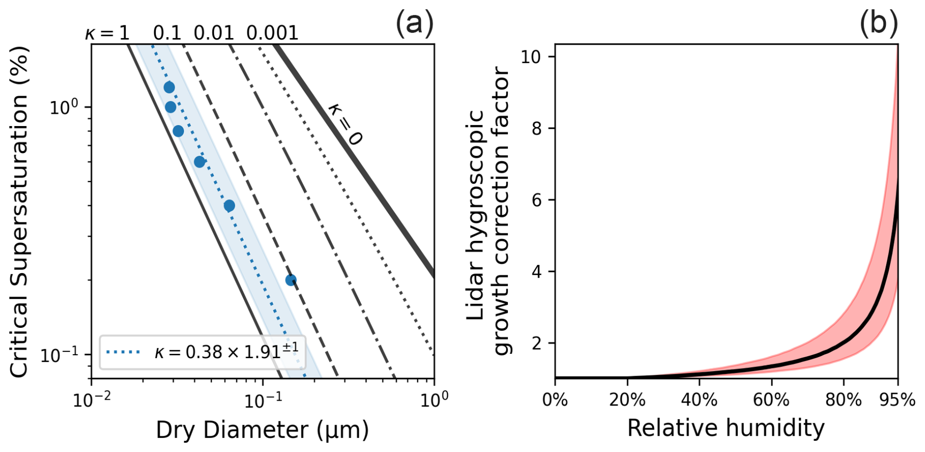 Figure 6(a) Blue scattered points represent pairs of critical supersaturation and corresponding critical dry diameter derived from aerosol size distribution and CCN measurements. The blue dotted line represents the geometric mean of derived aerosol hygroscopicity κ, and the shaded region represents the one geometric standard deviation of κ. κ= 1 line is shown in a solid black line; κ= 0.1 is shown in a dashed line; κ= 0.01 line is shown in a dash-dotted line; κ= 0.001 line is shown in a dotted line; and κ= 0 is shown in a thick solid black line. (b) Lidar hygroscopic growth correction factor as a function of relative humidity. The shaded area represents the uncertainties of the derived κ.