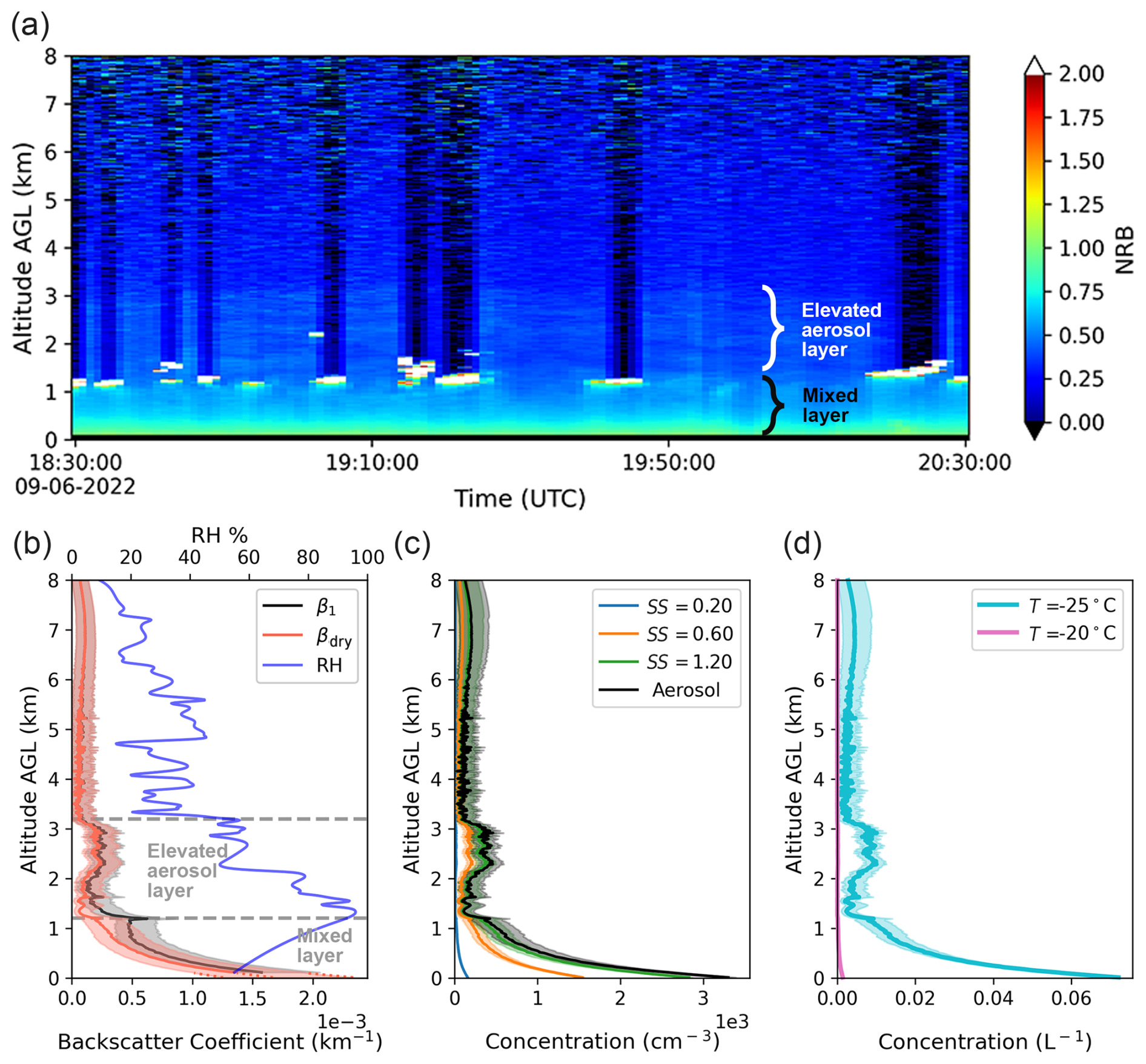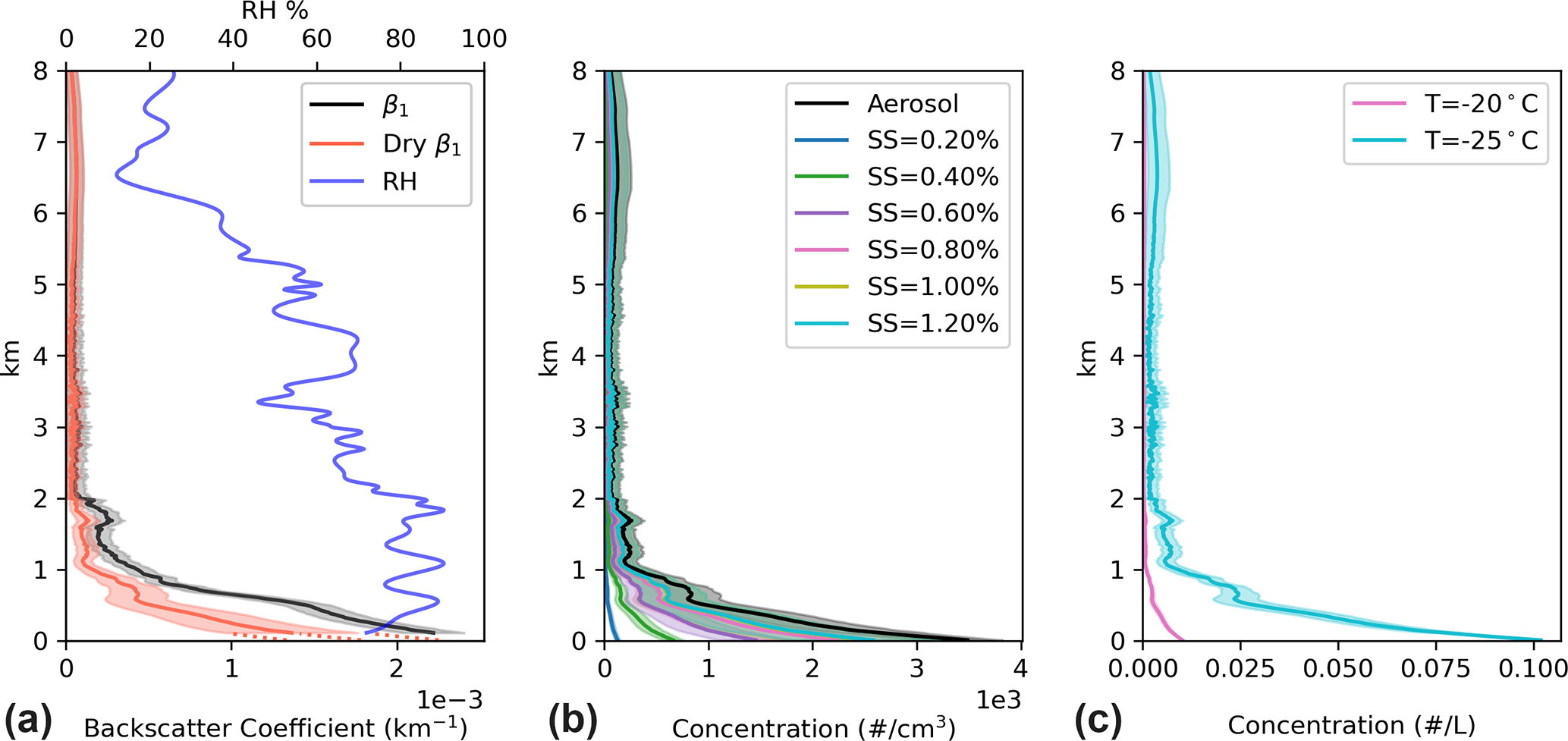 Figure 7a shows the aerosol backscatter coefficient profile (black line with gray shading for uncertainty), the RH profile (solid blue line), and the resulting dry aerosol backscatter coefficient profile (red line with red shading for uncertainty). The radiosonde has a relatively small uncertainty in RH measurements, specified as ±5 %. The uncertainty in the lidar hygroscopic growth correction factor, f(RH), is included in the overall uncertainty of the dry aerosol backscatter coefficient. Assuming that the aerosol, CCN, and INP properties at the surface are representative of the vertical profile, the aerosol (Np), CCN (NCCN), and INP (NINP) concentration profiles can therefore be estimated as: