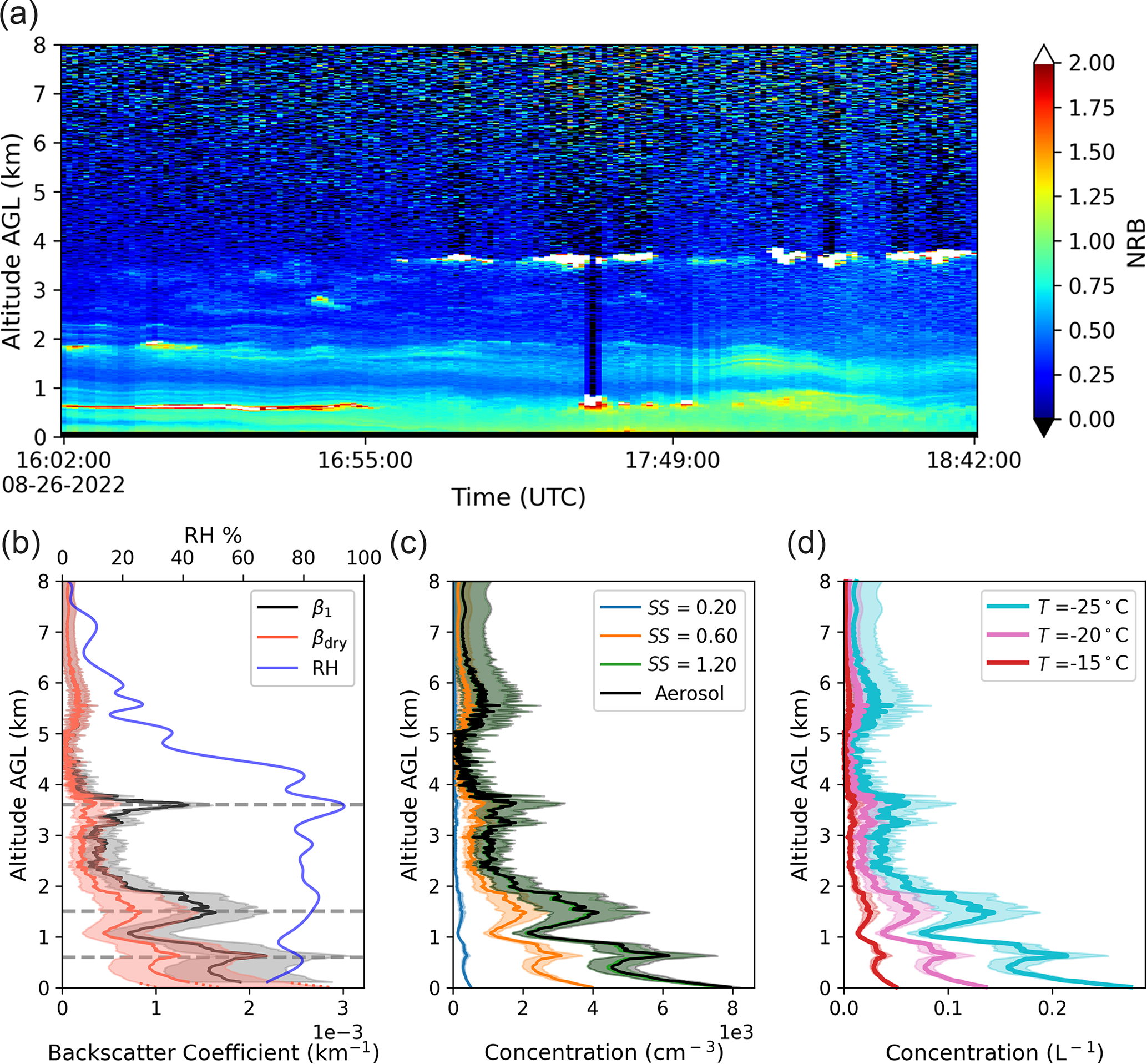Figure 10(a) NRB time series collected on 26 August 2022, from 16:02 to 18:42 UTC, with miniMPL in Galveston, Texas. (b) Aerosol and dry aerosol backscatter coefficient profiles are shown as solid black and red lines, respectively, with a shaded area showing the corresponding uncertainty interval for each profile. The relative humidity profile is shown as a solid blue line. Gray dashed lines indicate the cloud level. (c) The aerosol profile is shown as a solid black line. CCN profiles are shown in different colors corresponding to supersaturation levels of 0.2 %, 0.6 %, and 1.2 %. (d) INP profiles at −15, −20, and −25 °C.
