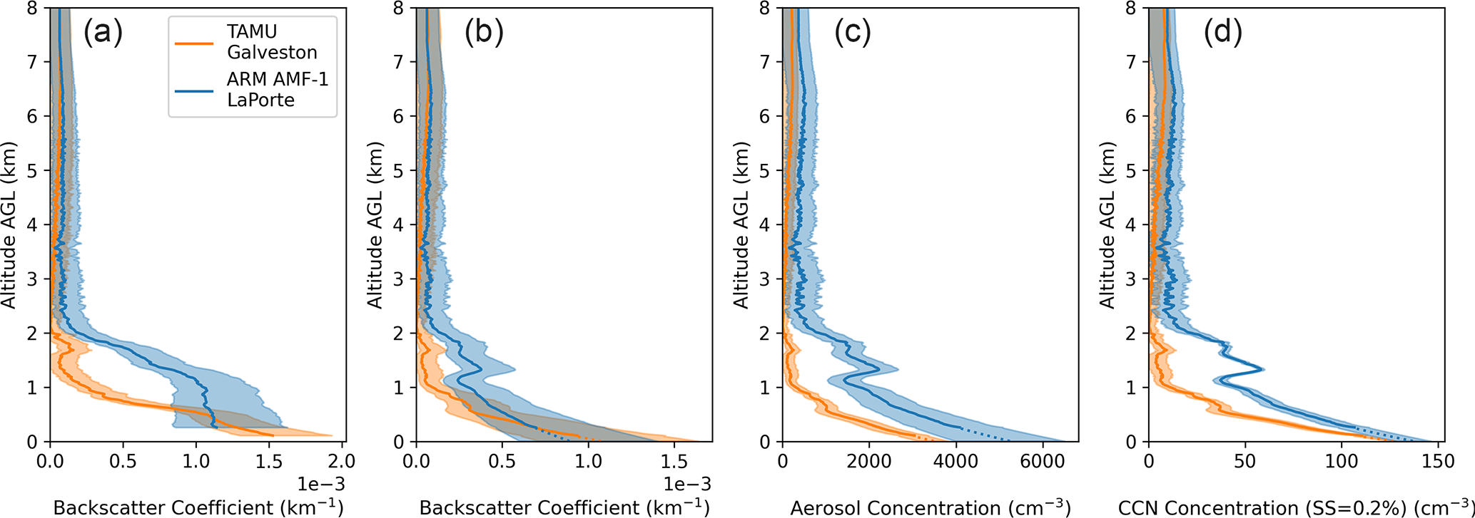 These differences highlight variations in aerosol and CCN distributions between the two locations, especially at upper altitudes. The La Porte site likely has a greater dry aerosol backscatter coefficient and aerosol concentration due to surrounding industrial emissions, while the TAMU Galveston site is more influenced by the maritime air mass. Despite similar surface aerosol and CCN number concentrations, there are clear differences in the aerosol and CCN vertical distribution between the two sites, only about 46 km apart. Such variability underscores the importance of localized aerosol vertical profile measurements in characterizing aerosol vertical distributions when assessing their impact on air quality, weather, and climate. It also highlights the necessity of deploying multiple measurement sites to capture the spatial heterogeneity of aerosol vertical profiles when conducting a field campaign that covers a large study area, especially in regions influenced by heterogeneous sources of emissions and complex airmass interactions.