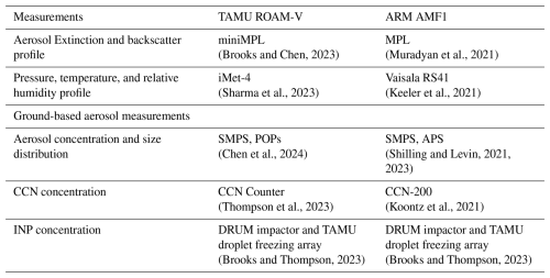 During the TRACER field campaign, the TAMU ROAM-V deployed a suite of surface aerosol measurements, which are used in this analysis (see Table 1). The ROAM-V platform shares a heated and dried isokinetic inlet among the TSI Scanning Mobility Particle Sizer (SMPS), the Droplet Measurement Technologies CCN counter, and an additional GRIMM Condensation Particle Counter (CPC). Details of the ROAM-V instrument sampling setup for the TRACER campaign and the particle loss corrections are further described in Thompson et al. (2025a).