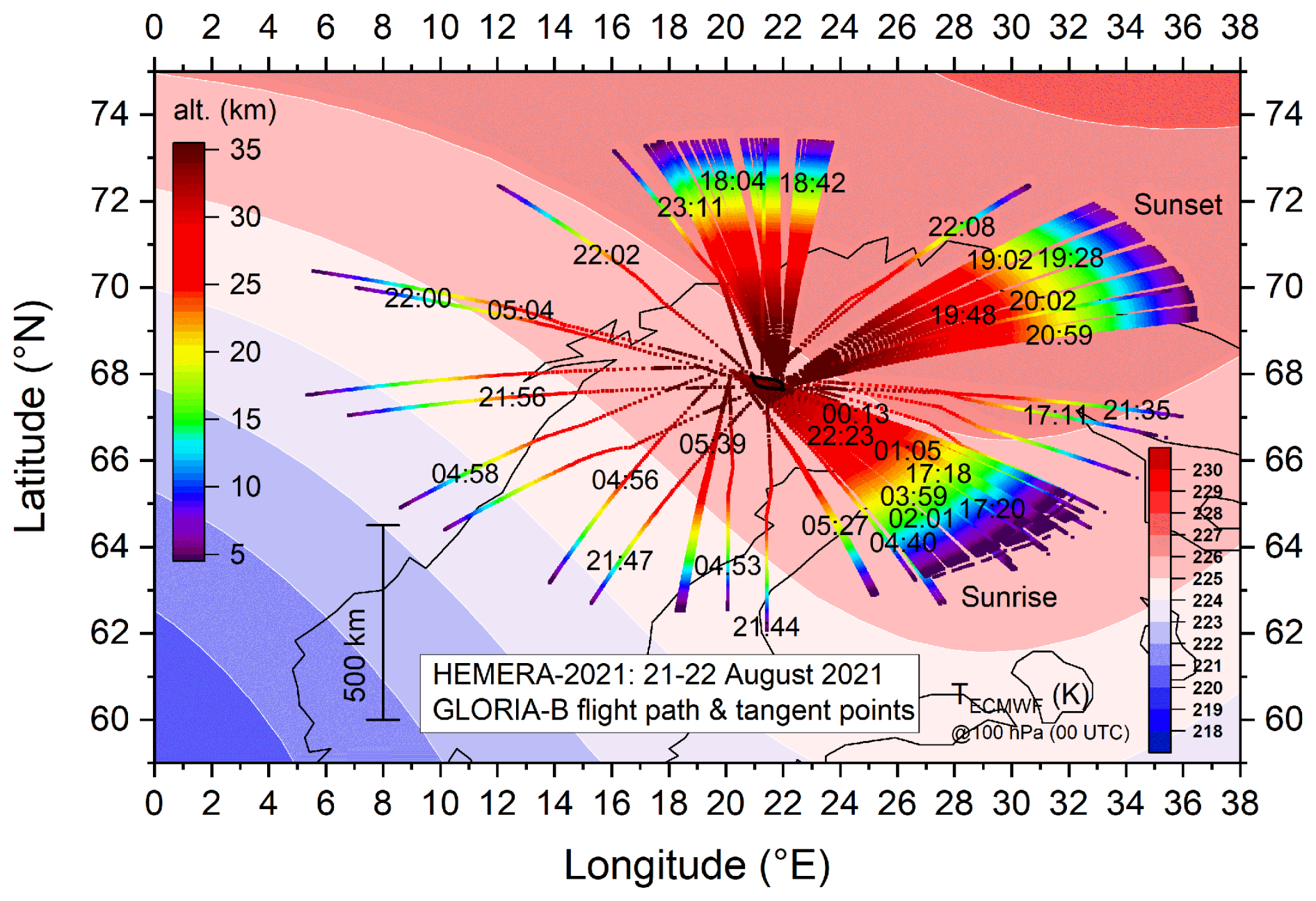 Figure 3Flight path of the balloon gondola on 21–22 August 2021 (black line) and GLORIA-B tangent points (altitude colour coded). Measurement times are given in UTC. European Centre for Medium-Range Weather Forecasts (ECMWF) 100 hPa temperature field at 00:00 UTC is indicated in the background.