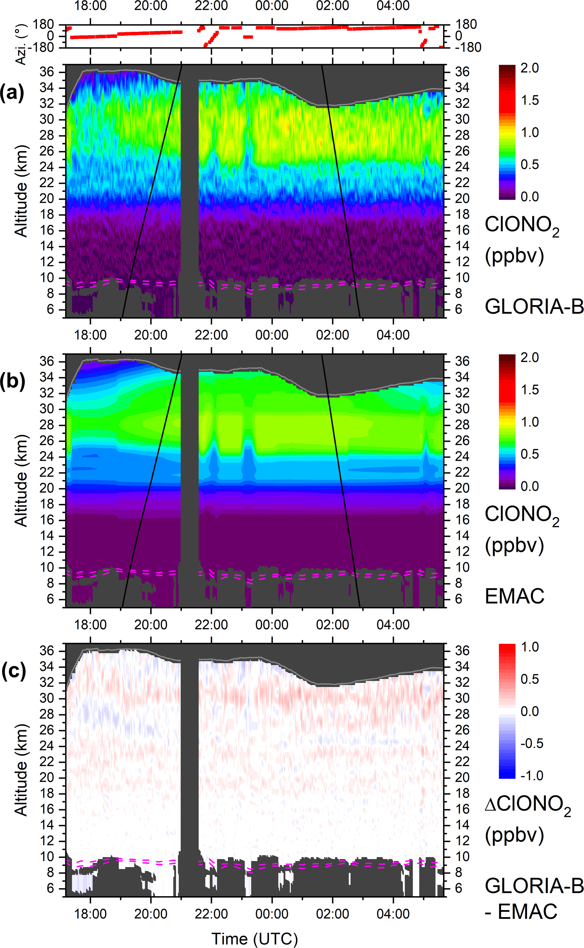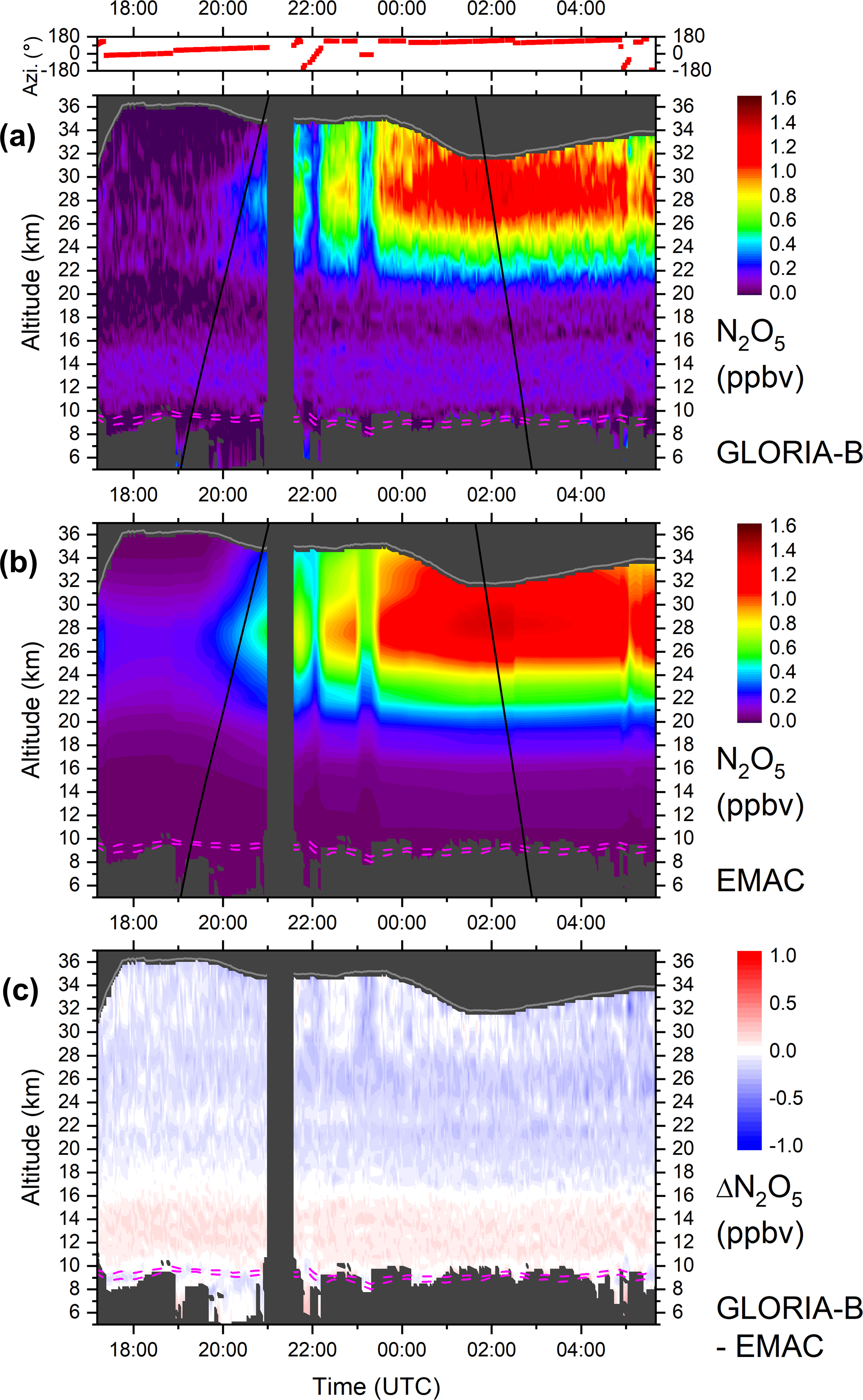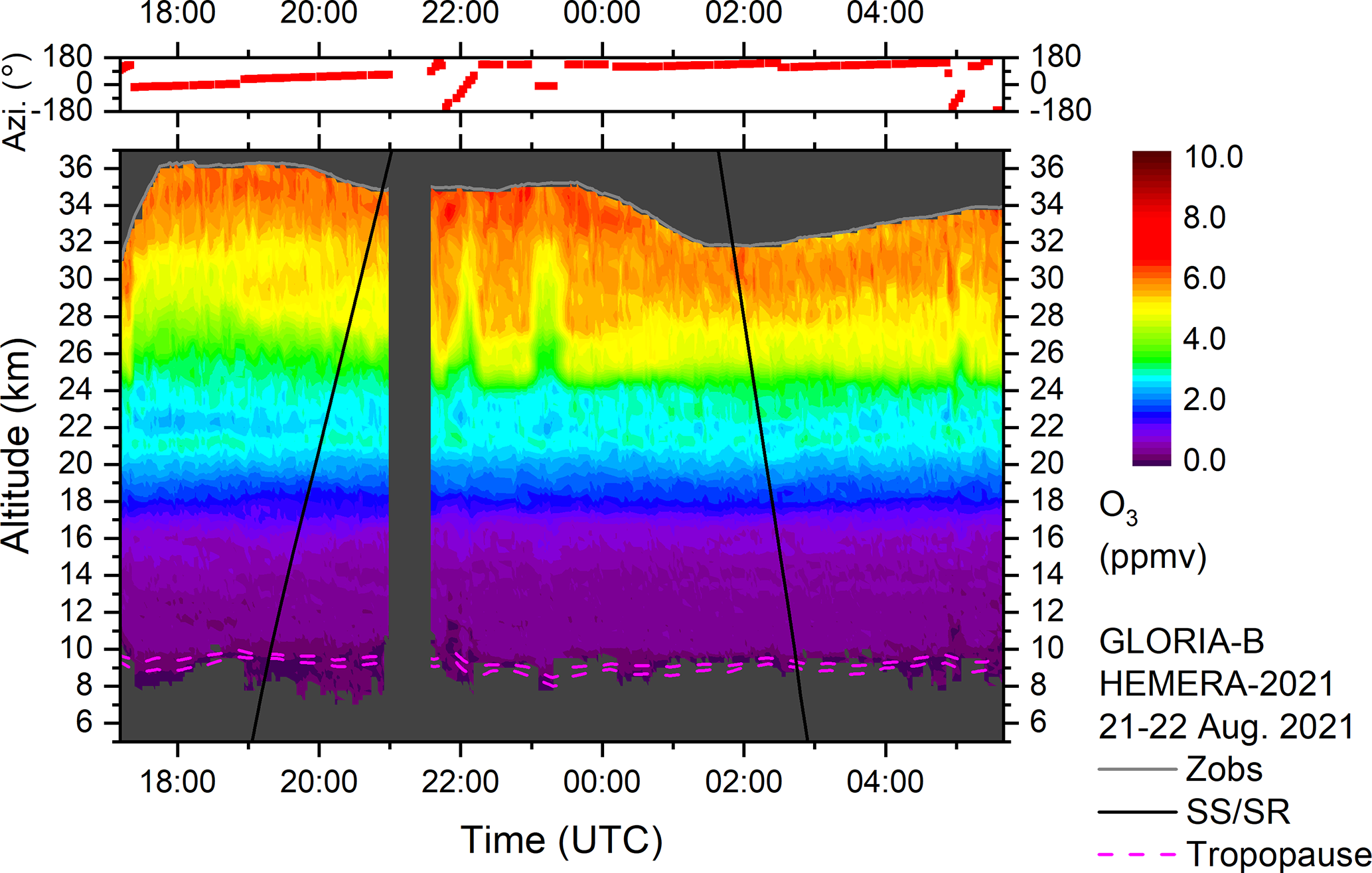 Figure 4Top: Azimuth orientation of the horizontal line of sight of the GLORIA-B instrument (0° = north, ±180° = south). Bottom: Temporal evolution of ozone volume mixing ratio (ppmv) as seen from GLORIA-B over northern Scandinavia. The grey solid line shows the observer altitude (zobs). Black solid lines mark sunset and sunrise terminators. Dynamical tropopause (2 and 4 potential vorticity units from ECMWF) is plotted as dashed magenta lines. Changes in the ozone VMR around 17:18, 22:05, 23:13, and 05:02 UTC correlate with azimuthal rotations which indicate a gradient in the horizontal ozone amount.
