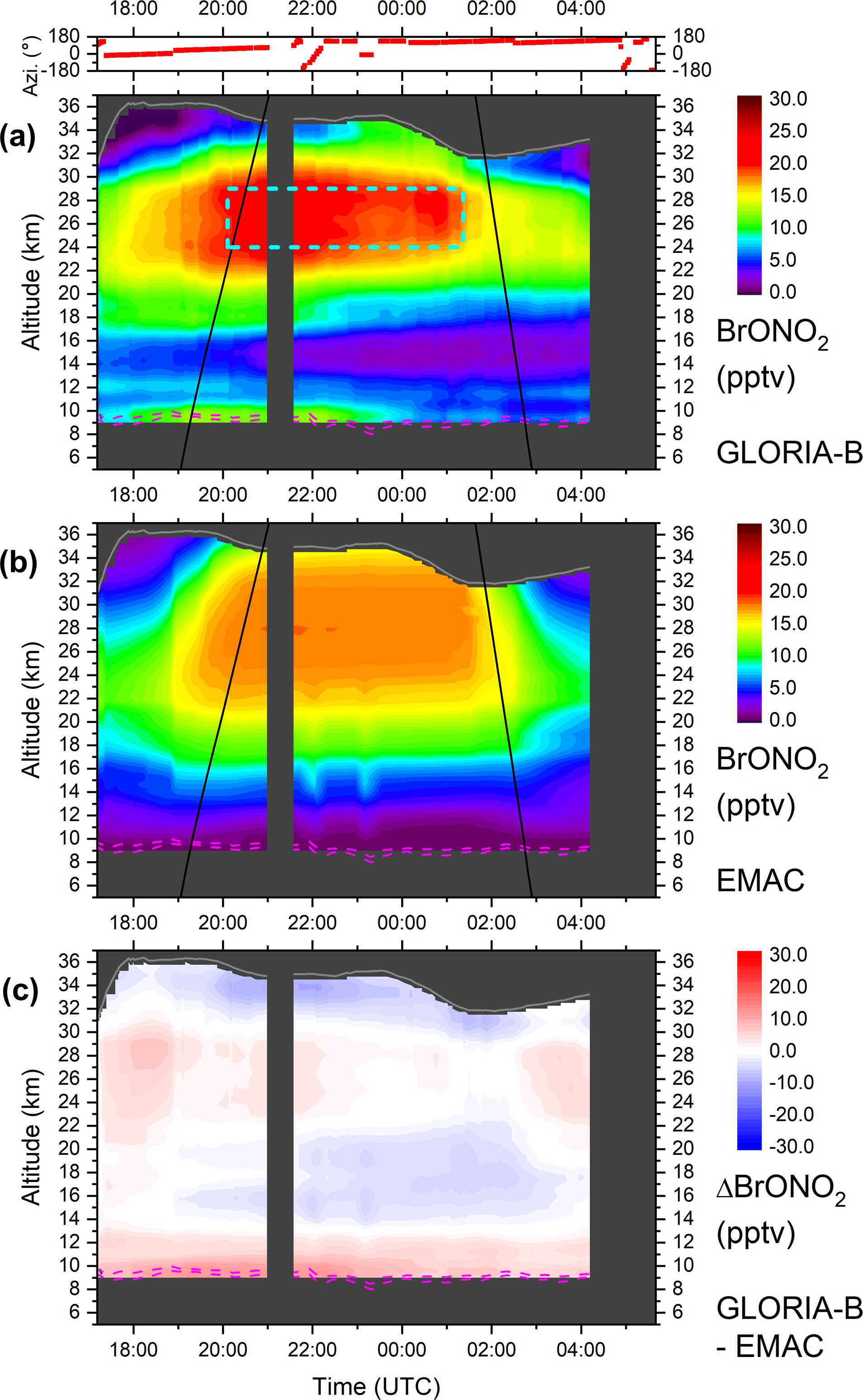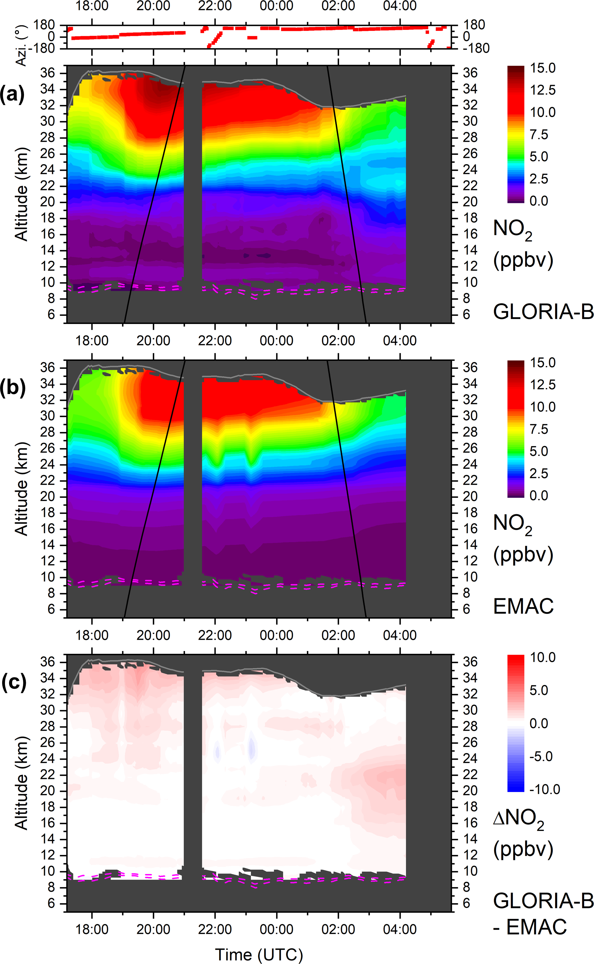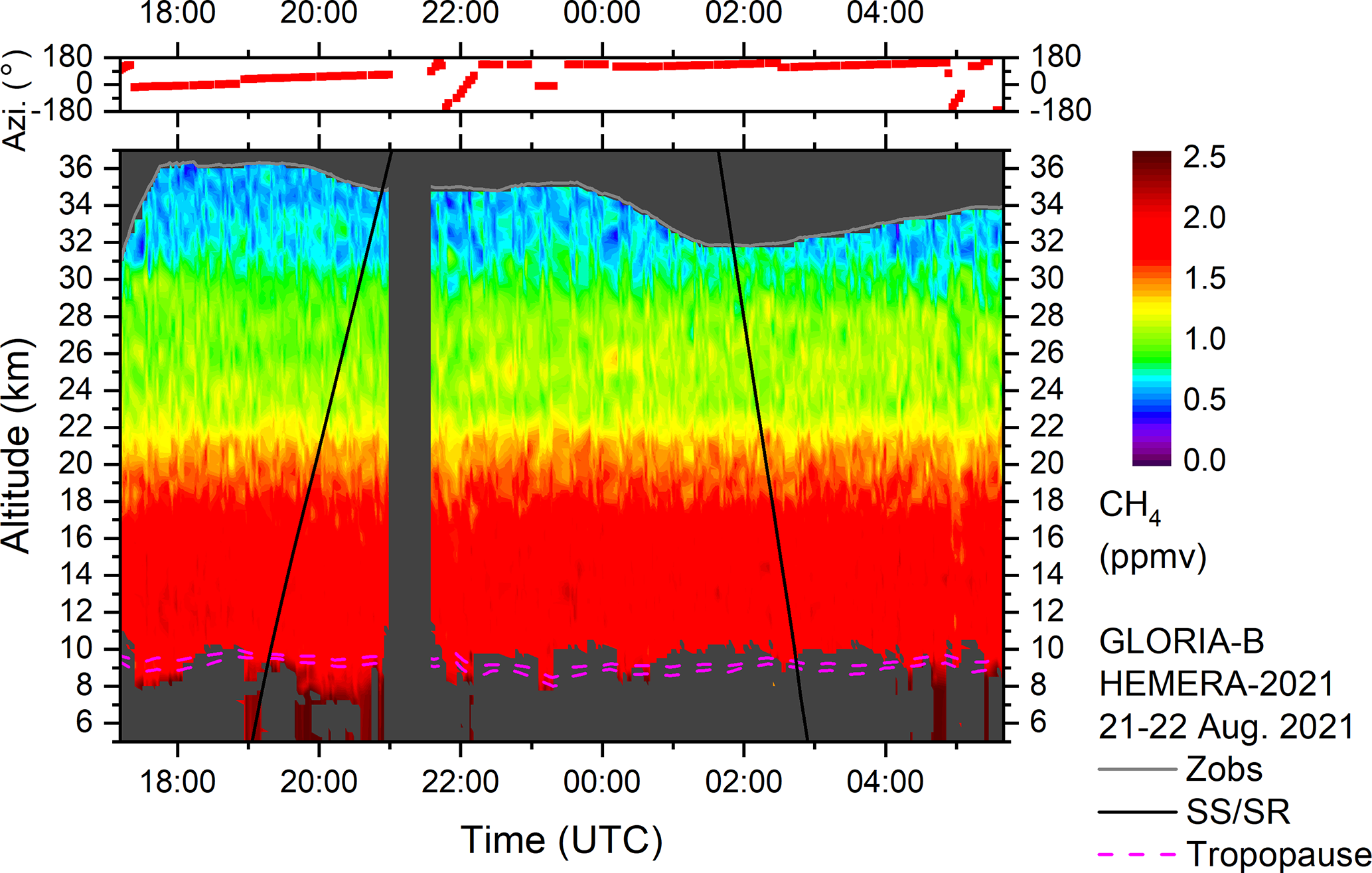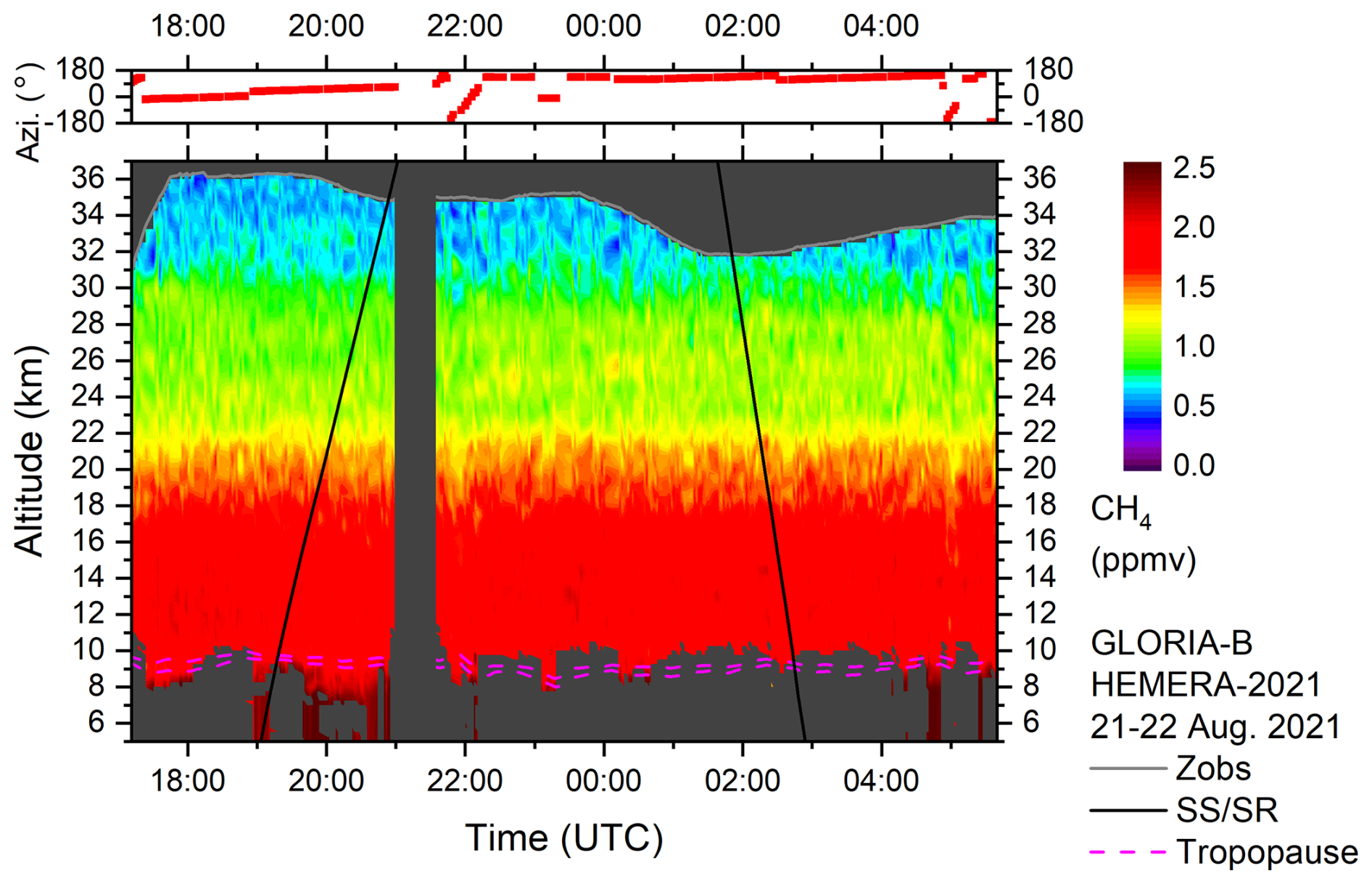 Figure 4Top: Azimuth orientation of the horizontal line of sight of the GLORIA-B instrument (0° = north, ±180° = south). Bottom: Temporal evolution of ozone volume mixing ratio (ppmv) as seen from GLORIA-B over northern Scandinavia. The grey solid line shows the observer altitude (zobs). Black solid lines mark sunset and sunrise terminators. Dynamical tropopause (2 and 4 potential vorticity units from ECMWF) is plotted as dashed magenta lines. Changes in the ozone VMR around 17:18, 22:05, 23:13, and 05:02 UTC correlate with azimuthal rotations which indicate a gradient in the horizontal ozone amount.