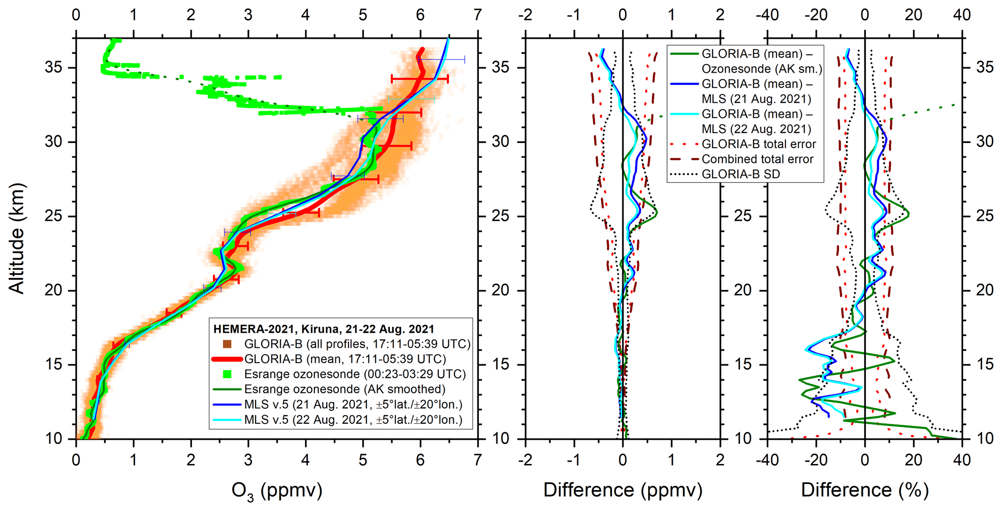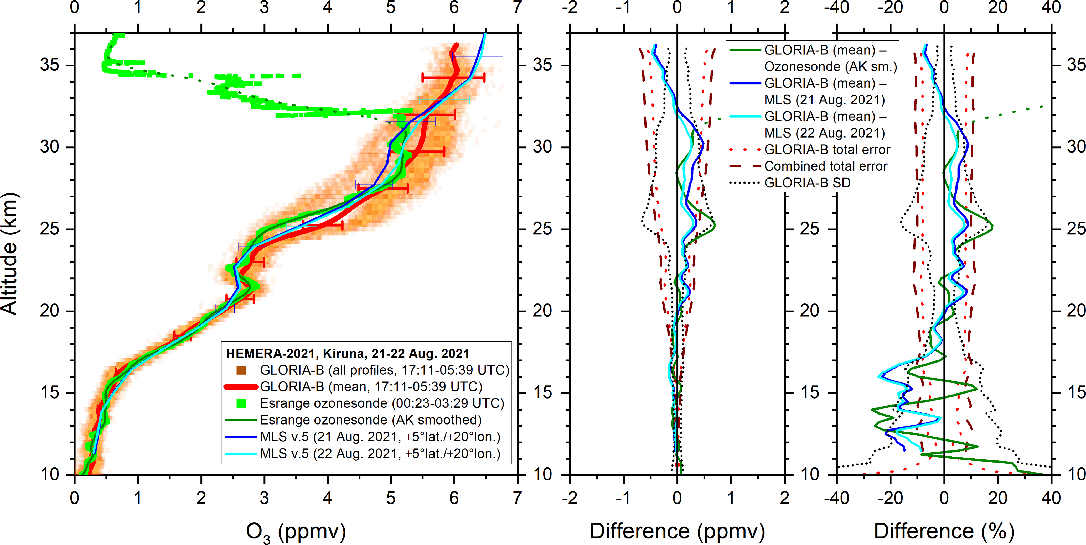 Figure 5Left: All measured GLORIA-B O3 data points (orange squares) and mean vertical profile (red solid line) compared to high-resolution ozonesonde data (green squares) and these data smoothed with the averaging kernel of GLORIA-B (solid dark green line, dotted outside altitude region of reliability). Satellite measurements (version 5) from the Microwave Limb Sounder (MLS), averaged in ±5° latitude and ±20°. longitude bins around the GLORIA-B mean observation are shown, too. Middle and right: Absolute and relative differences together with combined error bars and GLORIA-B standard deviation (SD).