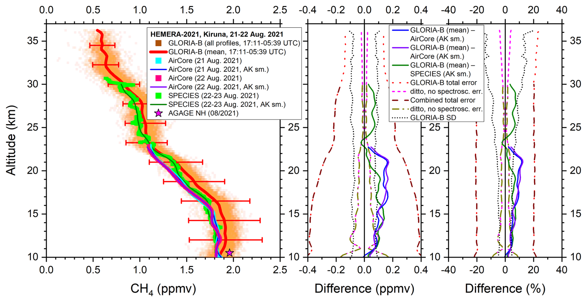 Figure 7Left: All measured GLORIA-B CH4 data points (orange squares) and mean vertical profile (red solid line) compared to in-situ AirCore (cyan and pink squares) and SPECIES data (green squares) and these data smoothed with the averaging kernel of GLORIA-B (solid blue, violet and dark green line). For comparison, a northern hemispheric lower tropospheric value from the AGAGE network is shown, too (magenta star). Middle and right: Absolute and relative differences together with combined error bars and GLORIA-B standard deviation (SD).