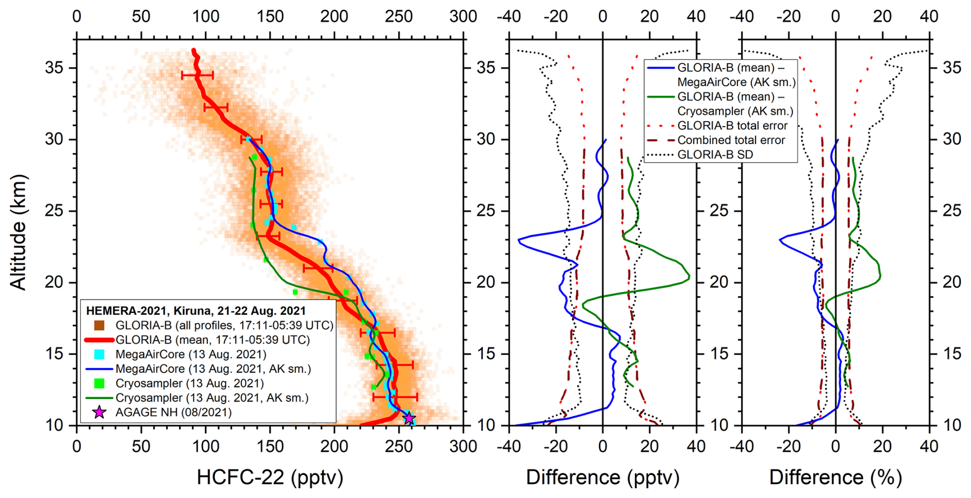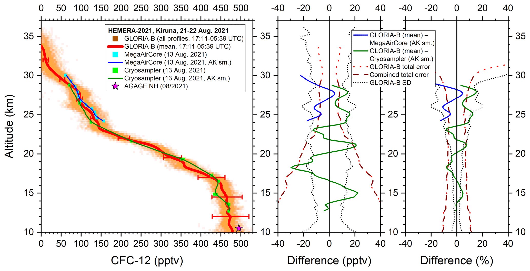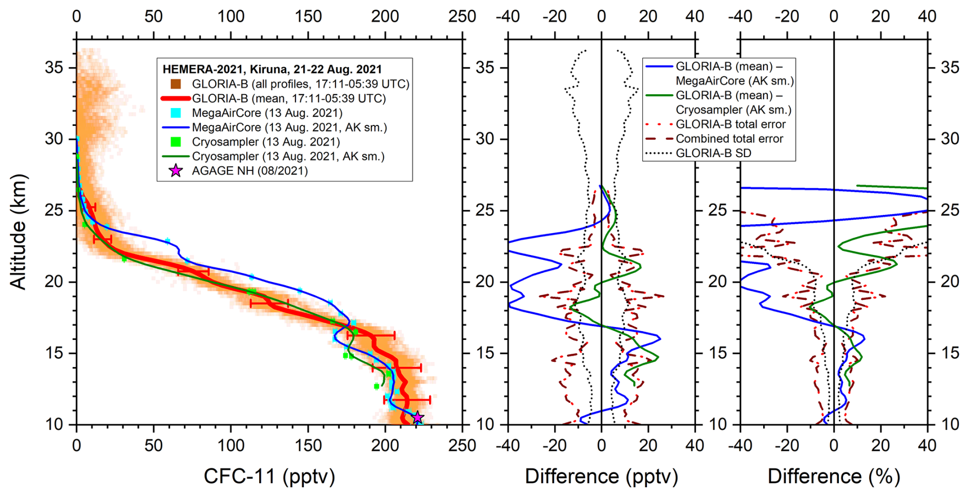 Figure 8Left: All measured GLORIA-B CFC-11 data points (orange squares) and mean vertical profile (red solid line) compared to in-situ MegaAirCore (cyan squares) and cryosampler data (green squares) and these data smoothed with the averaging kernel of GLORIA-B (solid blue and dark green line). For comparison, a northern hemispheric lower tropospheric value from the AGAGE network is shown, too (magenta star). Middle and right: Absolute and relative differences together with combined error bars and GLORIA-B standard deviation (SD).