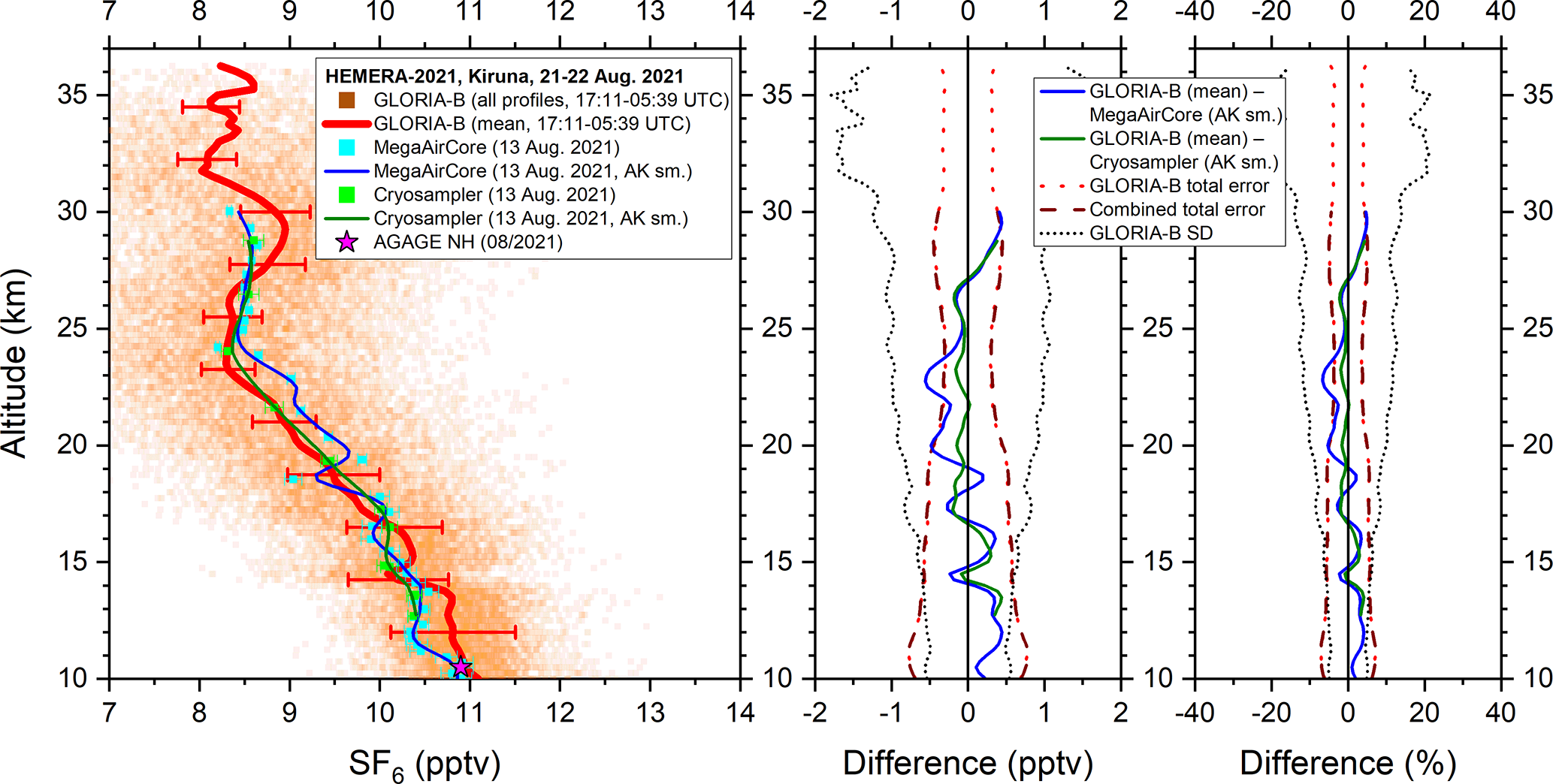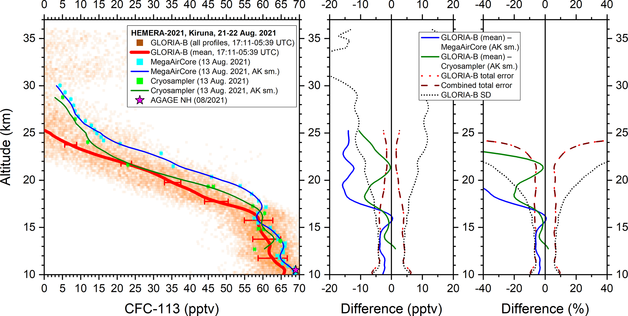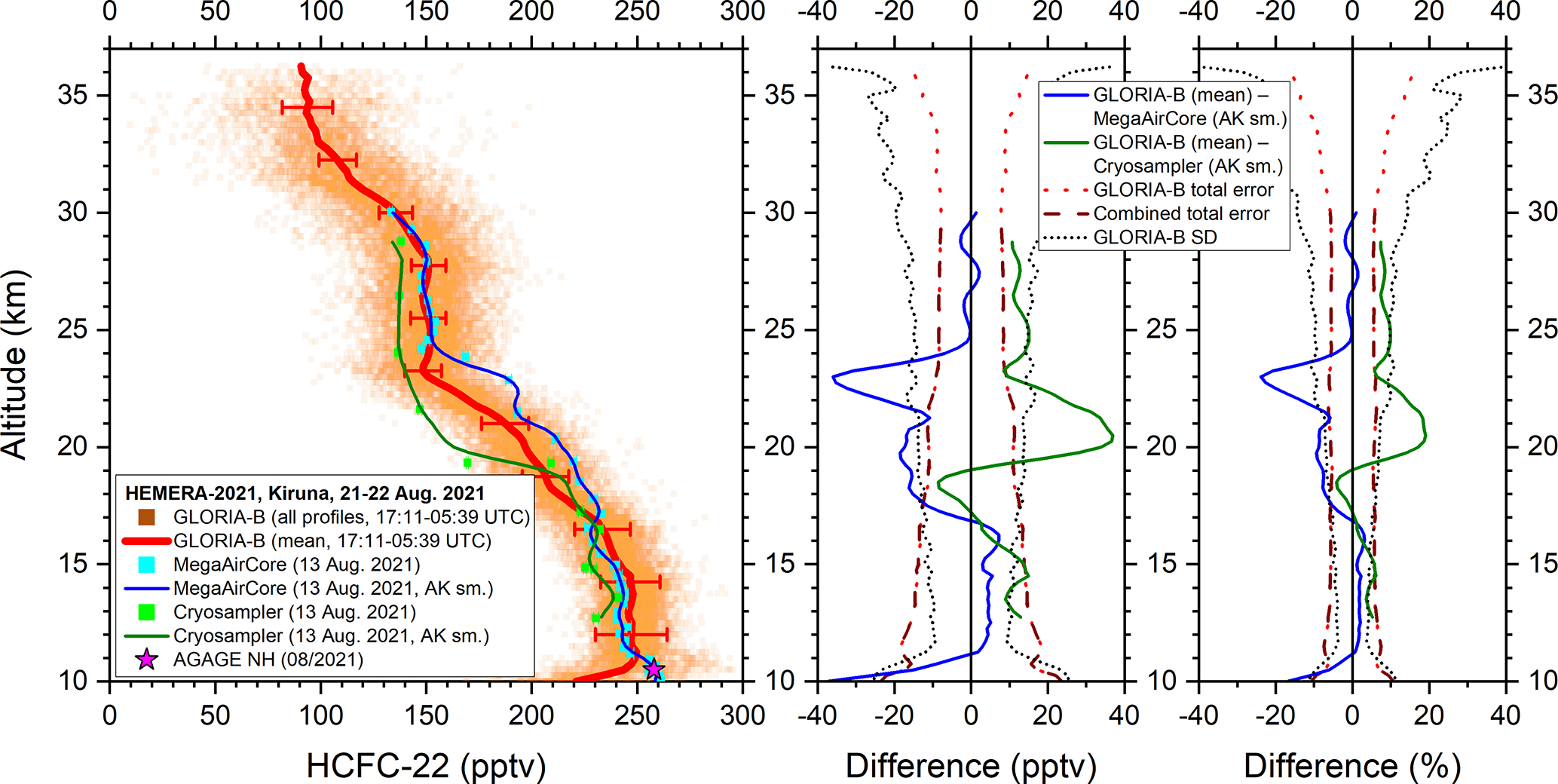Figure 8Left: All measured GLORIA-B CFC-11 data points (orange squares) and mean vertical profile (red solid line) compared to in-situ MegaAirCore (cyan squares) and cryosampler data (green squares) and these data smoothed with the averaging kernel of GLORIA-B (solid blue and dark green line). For comparison, a northern hemispheric lower tropospheric value from the AGAGE network is shown, too (magenta star). Middle and right: Absolute and relative differences together with combined error bars and GLORIA-B standard deviation (SD).