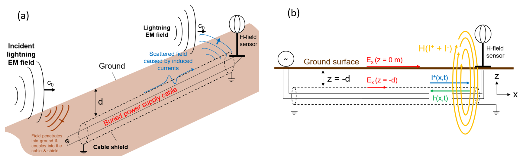 Figure 1Mechanism of lightning EM field coupling to a buried LLS sensor power supply cable. (a) Field-to-cable coupling mechanism, (b) shield currents and scattered H-field.