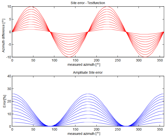 Figure 2Theoretical angle site errors (Azimuth difference, top) and amplitude site errors (Error [%], bottom), merely based on simplified geometrical considerations. The shown curves are evaluated assuming different shield current amplitudes, with higher currents corresponding to higher site errors. (Graphic reused with permission from Schulz and Diendorfer, 2002.)