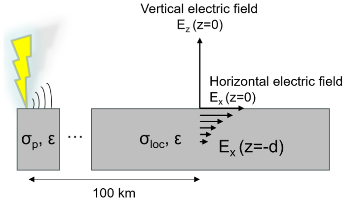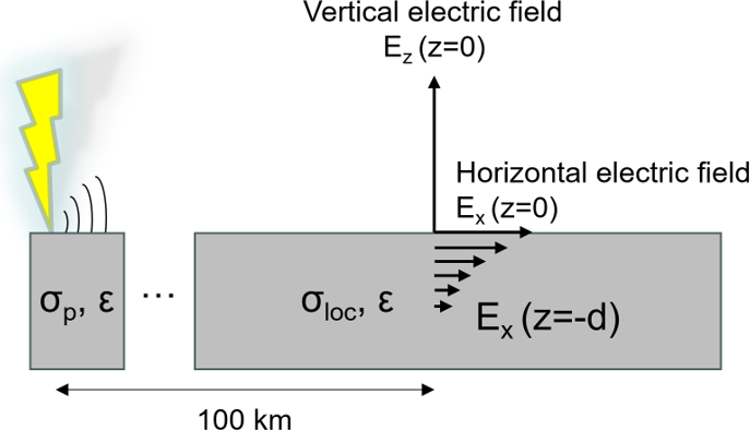 The next step is to determine the radial E-field (Er) in the direction of propagation, at the ground level and below the ground surface. To achieve this, the procedure described in Rubinstein (1996) is implemented, in which the so-called “wave-tilt” formula (Rubinstein, 1996) is used to obtain the radial E-field at the ground surface from the horizontal H-field as determined in the previous step, through the surface impedance of the air-ground interface: