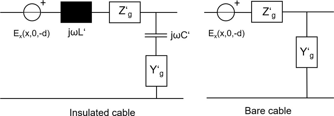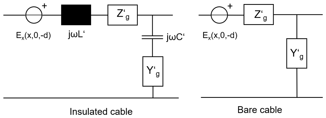 Figure 5Equivalent circuit based on the Transmission Line model of an infinitesimal element of the cable (left: insulated, right: bare) in presence of an external electromagnetic field (tangential E-field, Ex).