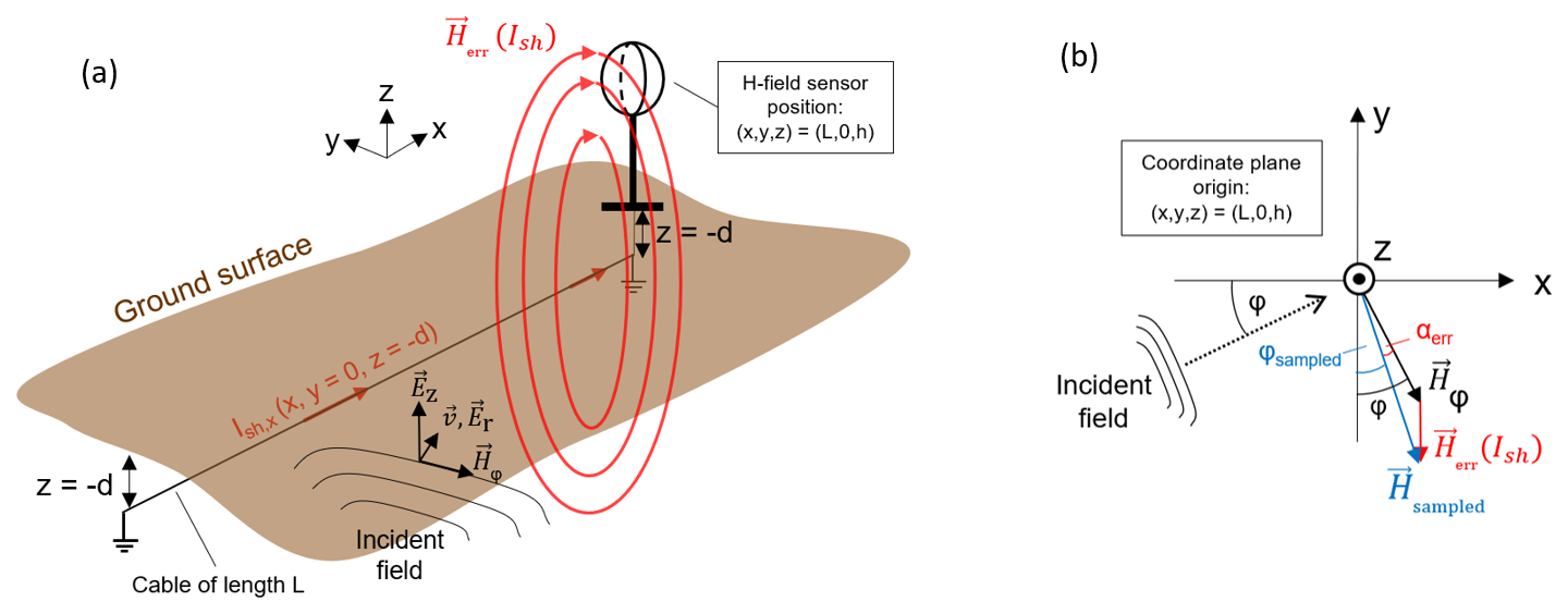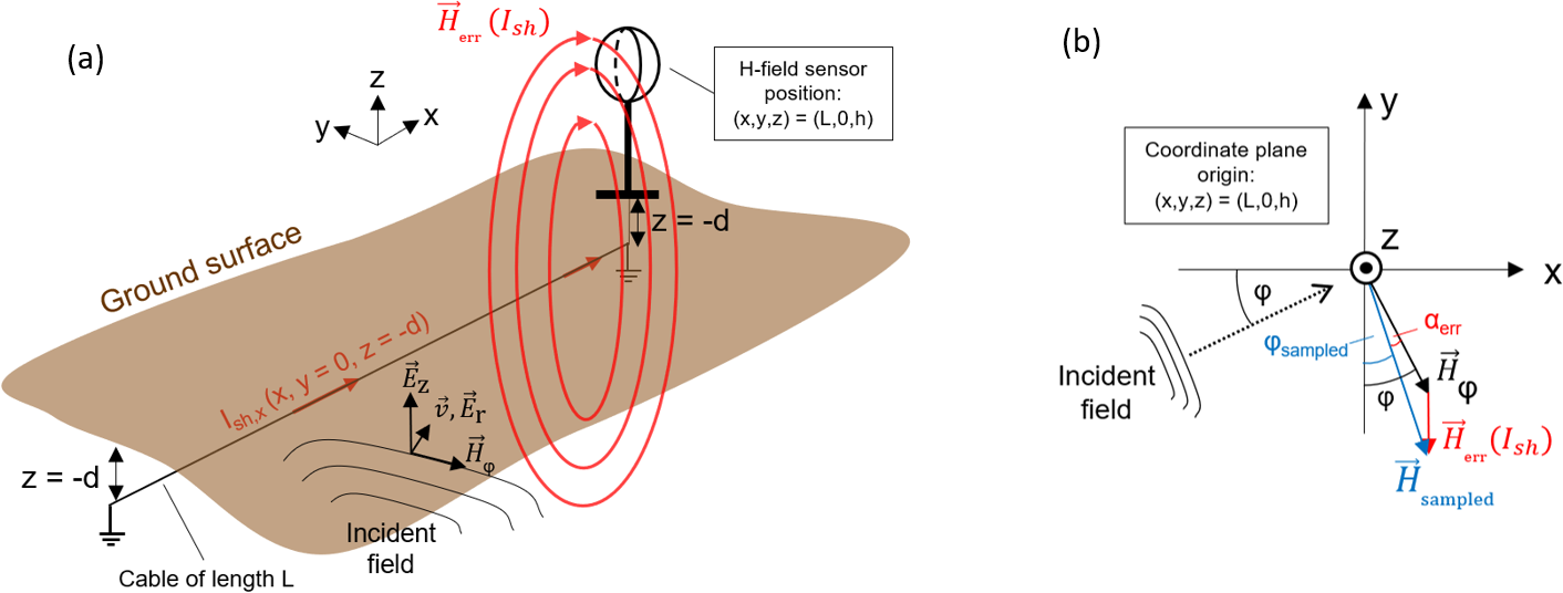 Figure 6Illustrations of LLS angle and amplitude site errors caused by the induced shield currents in the power supply cable. (a) Three-dimensional view of the electromagnetic environment in the vicinity of the H-field sensor, positioned at the cable head at = . The supply cable is oriented in the x-direction. The incident field is indicated together with its propagation velocity vector v (with ) and its field components Hφ, Ez and Er. The x-directed shield current, induced by the incident field, is indicated by the red arrows along the cable and denoted as Ish,x. (b) Top-down view (xy-plane) of panel (a) centered at the H-field sensor at = . The direction of the incident field is marked by the dotted arrow. The horizontal magnetic component of the incident EM field, Hφ (black), the scattered field, Herr (red), and the sampled field , (blue) are also shown. The angle error is denoted as αerr (red) and the amplitude error results from the difference between the magnitudes of the vectors Hsampled and Hφ.