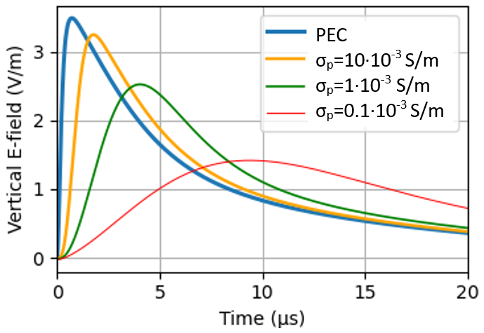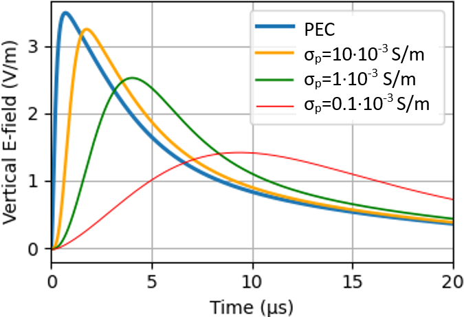 Figure 7Distant vertical electric field (100 km) at the ground level as a function of the ground electric conductivity (PEC, σp = 10 × 10−3, 1 × 10−3 and 0.1 × 10−3 S m−1).