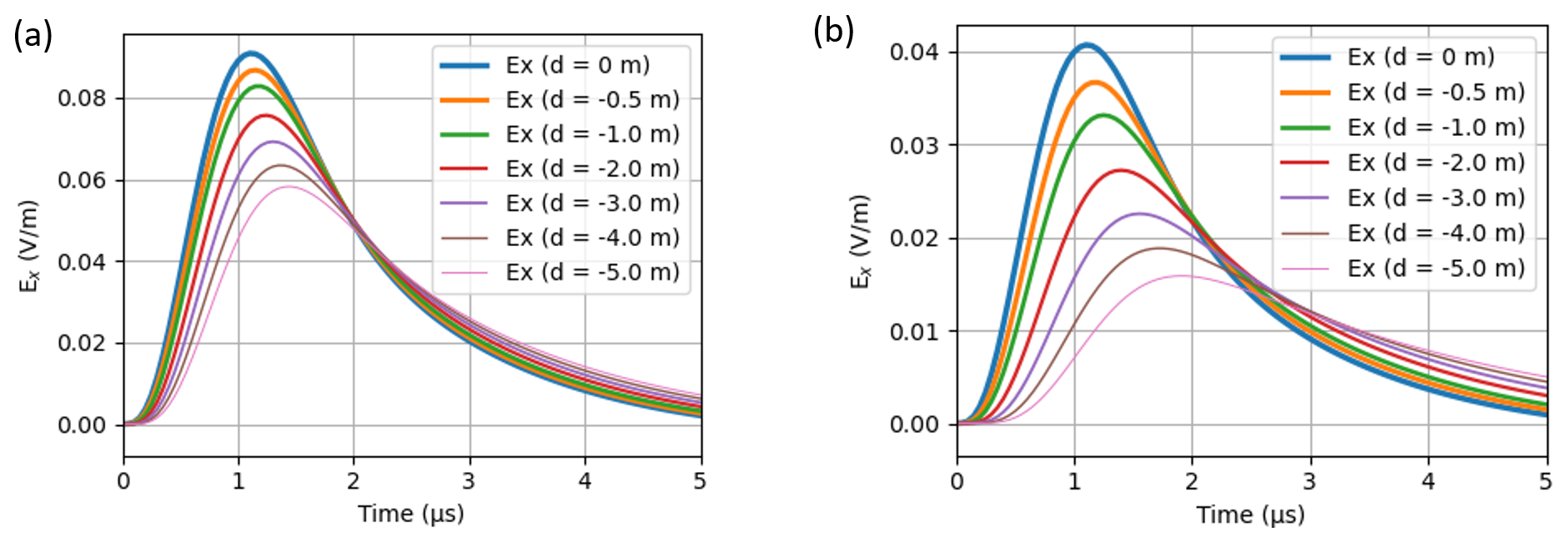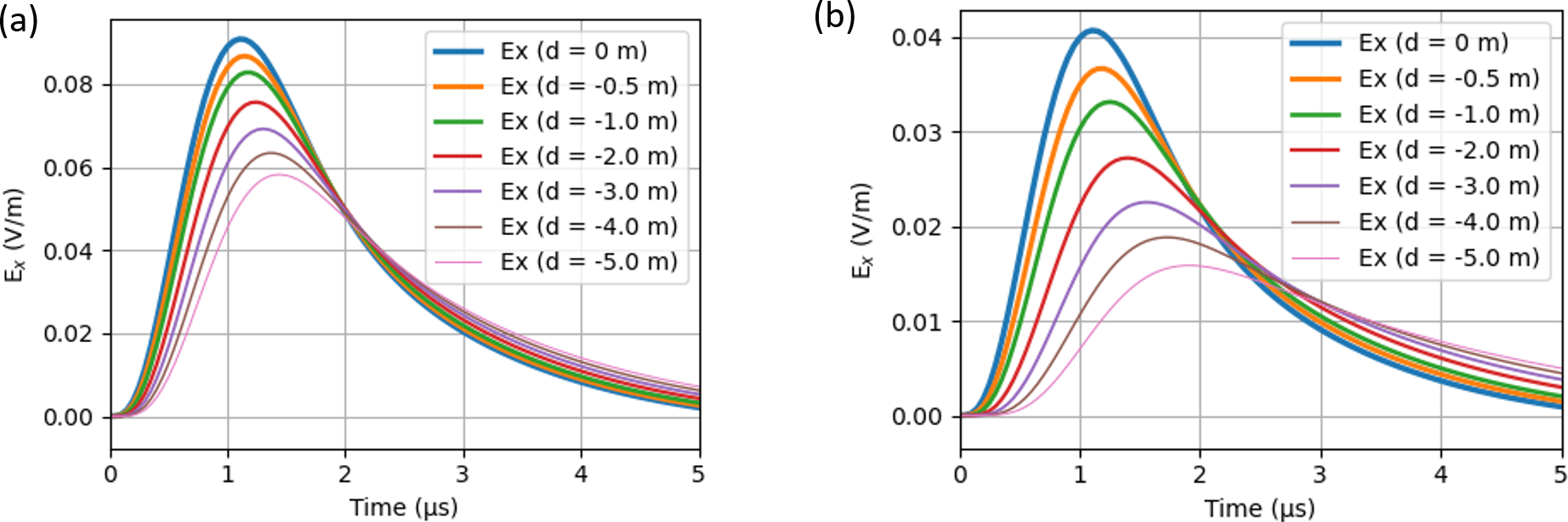 As previously shown in Fig. 7, propagation over a highly conducting ground (ideally PEC) preserves the high-frequency content of the propagating fields. This results in incident fields exhibiting fast transients and corresponding short risetimes. In contrast, propagation over less conductive ground attenuates the high-frequency content and causes dispersion, leading to incident fields with slower transients and longer risetimes. Examination of Fig. 10a now reveals two key aspects.