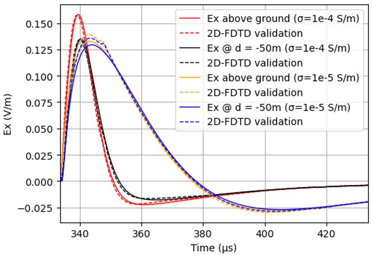 Figure 9Validation of the proposed approach with respect to FDTD simulations. Shown are the E-fields at the ground level and 50 m below ground for very low ground conductivities σloc = 10−4 S m−1 and σloc = 10−5 S m−1, with σp = 10−4 S m−1. The time-axis represents the absolute time of arrival of the EM field at a distance of 100 km (approximately 333 µs).