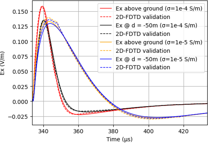 Since these horizontal E-fields serve as the input for the cable current coupling model, ensuring their validity is crucial for achieving accurate results in subsequent computational steps. Thus, the fields were validated through cross-comparison with results obtained from a cylindrical-symmetry 2D-FDTD solver (Oskooi et al., 2010; NanoComp, 2025). The results for both approaches are found to be in excellent agreement. A validation example is shown in Fig. 9. The depicted scenario represents very low ground conductivities (0.1 × 10−3 and 0.01 × 10−3 S m−1) and large depths (d = −50 m) below ground. The difference in the amplitudes between the fields at ground level and those below ground is very small, indicating that attenuation in low-conductivity ground is negligible for typical burial depths of power supply cables, which range from a few tens of centimeters to about 1 m.
