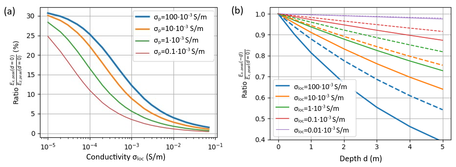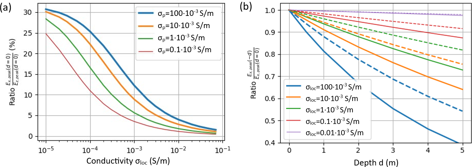 Figure 10Field peak ratios for various local ground conductivities σloc and the impact of the propagation ground conductivity σp. (a) Ratio of the horizontal Ex-field peak to the vertical Ez-field peak at the ground surface level, as a function of the local ground conductivity σloc, in %. Plotted for different propagation ground conductivities σp. (b) Ratio of the peak value of the Ex-field at a depth of d meters below ground to that at the ground surface level. The solid lines represent a propagation conductivity σp = 10 × 10−3 S m−1 while the dashed lines correspond to σp = 1 × 10−3 S m−1.