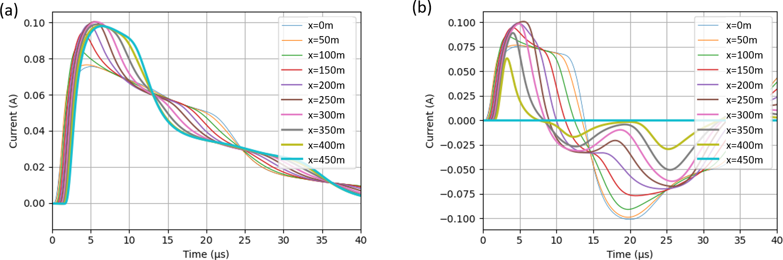 Figure 11Shield currents of an insulated cable of 450 m length at various locations x responding to a distant (100 km) lightning-incident field, as shown in Fig. 7 for σp = 10 × 10−3 S m−1, σloc = 10 × 10−3 S m−1. Burial depth d = 1 m. The incident angle is φ = 0° relative to the cable (aligned in x-direction). (a) Both ends grounded (Z1 = Z2 = 10 Ω). (b) One end grounded, one open (Z1 = 10 Ω, Z2 = 10 MΩ).