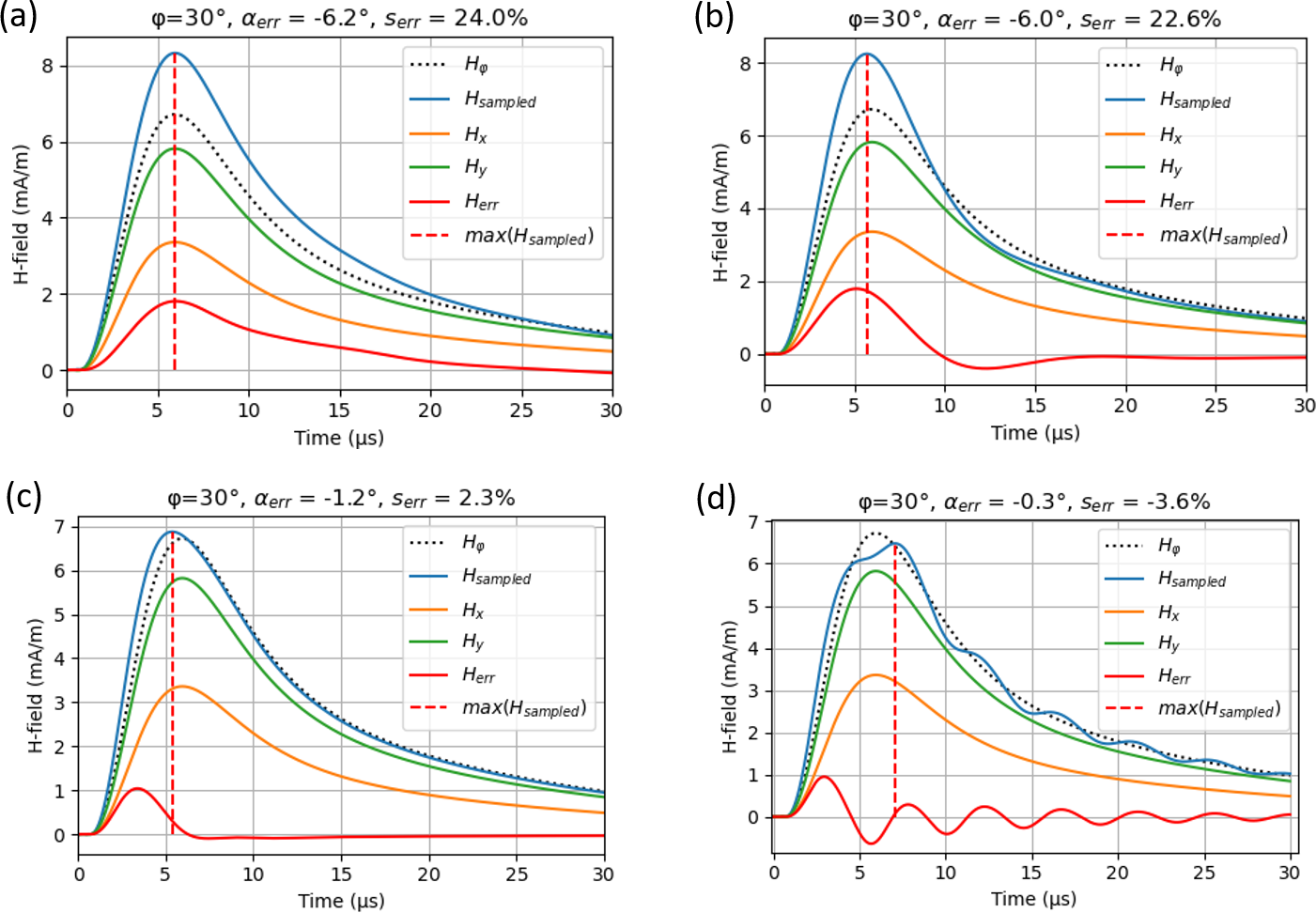 Figure 13Dependence of the magnetic fields on the local ground conductivity. All magnetic field components are shown for an incident EM field (compare Fig. 6, whereby this graph has been adapted to depict all fields with positive polarity). The incident angle is φ = 30° relative to the cable (aligned in x-direction). The resulting angle errors αerr and amplitude errors serr are presented on the top of each figure. The insulated cable length is L = 200 m and buried 1 m below ground. Conductor radius: ρa = 10 mm, outer radius ρb = 15 mm, cable jacket permittivity εr,d = 3. Sensor position (line end) at z = +2 m. 100 km distance to the lightning strike. σp was set to 1 × 10−3 S m−1. The DC termination impedances Z1,2 correspond to a vertical grounding rod of 10 m length and 3 cm thickness for the considered ground conductivity σloc. (a) σloc = 10 × 10−3 S m−1, Z1,2 = 15.5 Ω, (b) σloc = 1 × 10−3 S m−1, Z1,2 = 155 Ω, (c) σloc = 0.1 × 10−3 S m−1, Z1,2 = 1.55 kΩ, (d) σloc = 0.01 × 10−3 S m−1, Z1,2 = 15.5 kΩ.