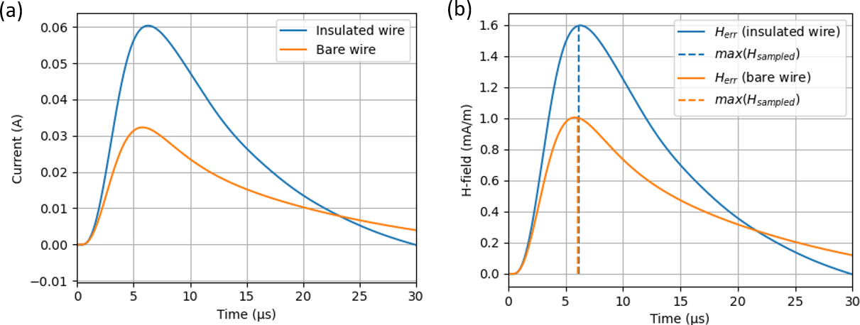 Figure 14Induced currents and scattered magnetic fields: insulated vs. bare conductors. L = 100 m, ρa = 10 mm, ρb = 15 mm, cable jacket permittivity εr,d = 3. Sensor position (line end) at z = +2 m. σp = 1 × 10−3 S m−1, σloc = 10 × 10−3 S m−1, εr,g = 10 and Z2 = 10 Ω. The incident angle is φ = 30°. (a) Current at the line end (Z2 = 10 Ω): Insulated (blue) vs. bare conductor (orange). (b) Scattered field Herr resulting in αerr = −5.8° and 22 % (insulated wire, blue) and αerr = −3.9° and 13.7 % (bare wire, orange).