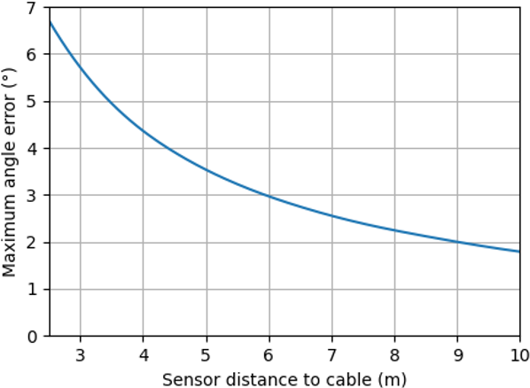 Figure 16Dependence of the angle site error on the vertical distance of the H-field sensor to the supply cable. Cable burial depth d = 0.5 m, σloc = 10 × 10−3 S m−1. The maximum angle errors should be interpreted as ± the values shown on the y-axis, according to the two-cycle error characteristic.