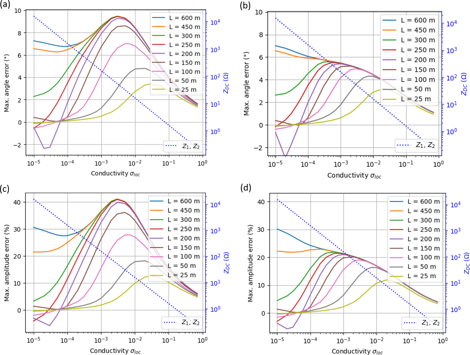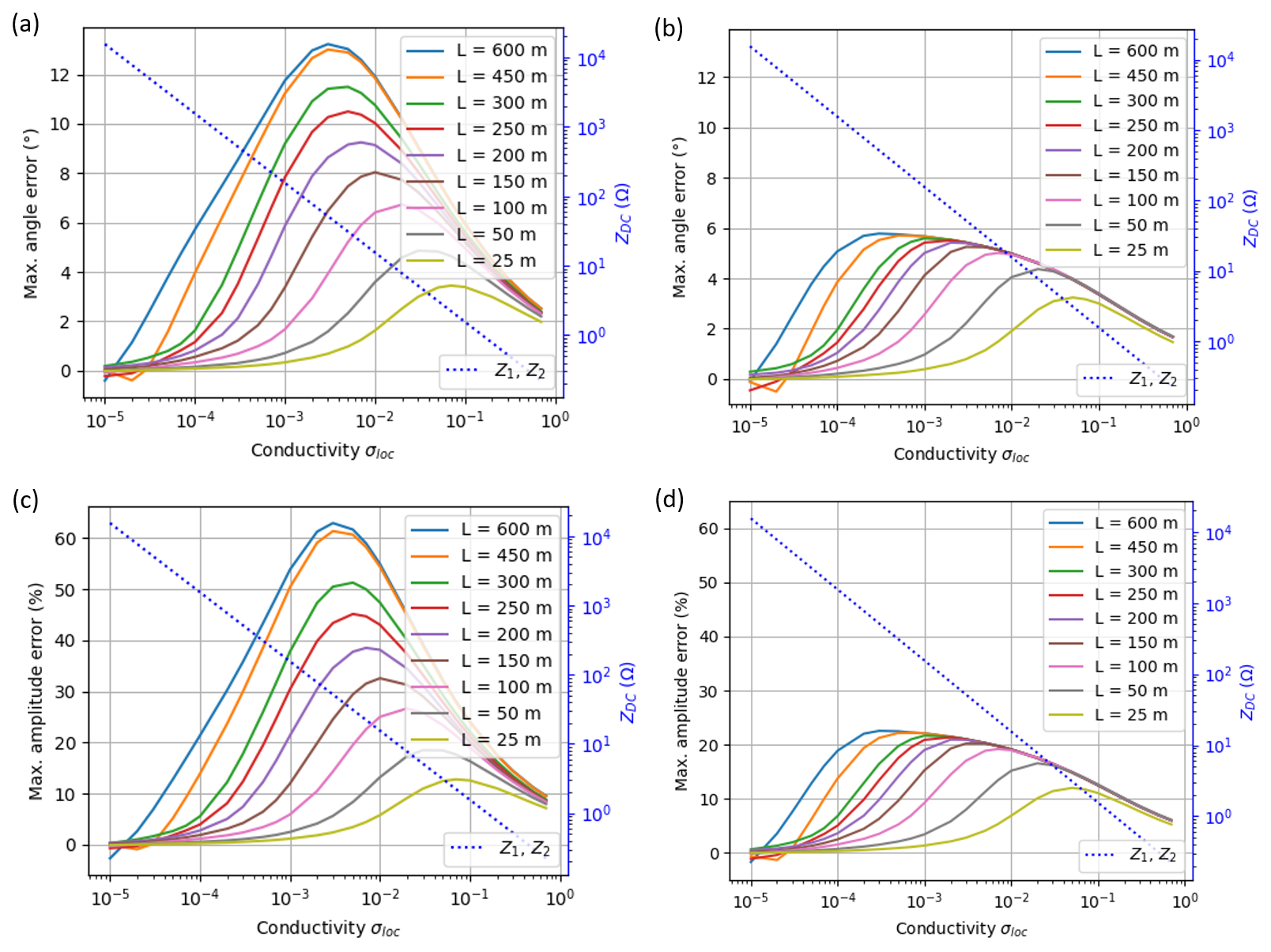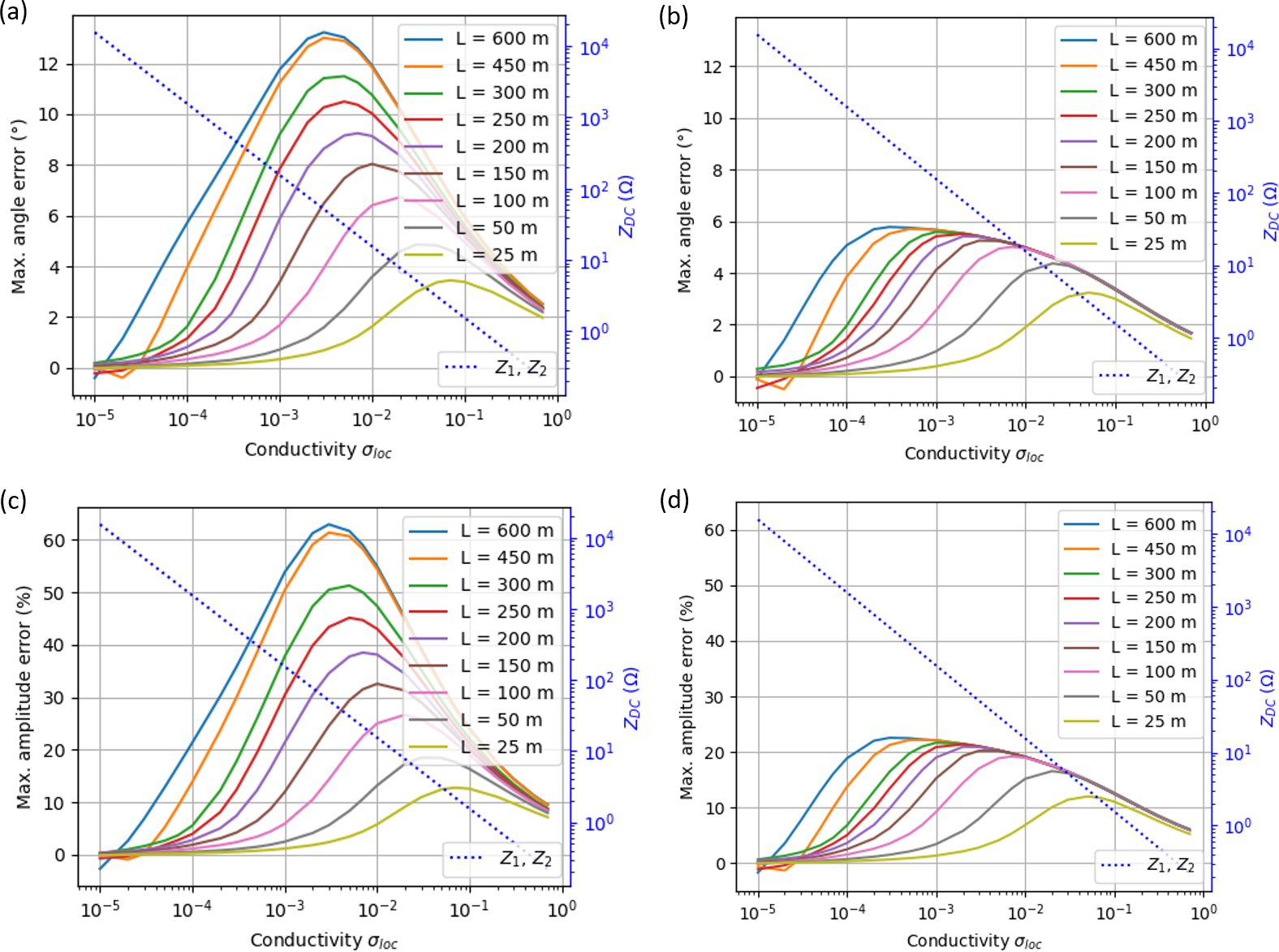 Figure 17Influence of local ground conductivity σloc, cable length L and (conductivity- and frequency-dependent) termination impedances Z1 and Z2 on site errors. σp = 1 × 10−3 S m−1, burial depth d = 0.5 m. Sensor position at z = 2 m. The order of the color legend agrees with the maximum site errors according to the line lengths: largest site errors for L = 600 m on top of the legend, monotonically decreasing to the smallest site errors for L = 25 m at the bottom of the legend. (a) Maximum angle site errors αerr (insulated conductor), (b) maximum angle site errors serr (bare wire), (c) maximum amplitude site errors αerr (insulated conductor wire), (d) maximum amplitude site errors serr (bare wire).