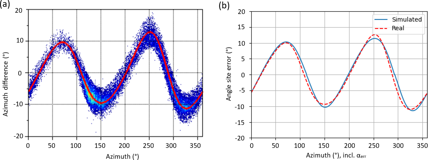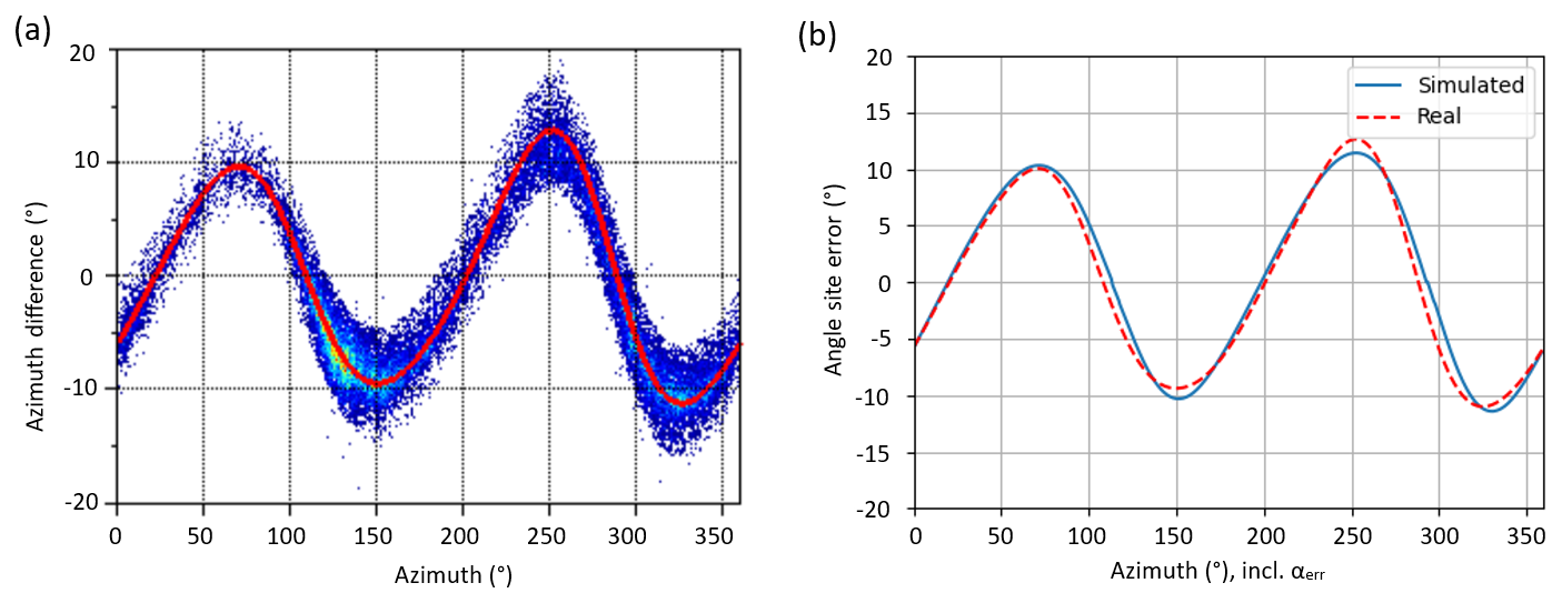 Figure 19Panel (a) shows the mean site error (red solid line) of real measured site errors in a scatter plot of individual pixels that indicate the number of detected lightning EM fields from low (blue) to high (yellow/orange), and is compared to simulation results in panel (b), based on the methodology presented in this paper. Parameters: σp = 0.2 × 10−3 S m−1 to obtain incidents fields of about 8–9 µs rise time (according to the median measured rise time at the sensor site). σloc = 10 × 10−3 S m−1, εr,g = 10. A 600 m long insulated power supply cable, oriented at φ = 290°, is assumed to be buried 20 cm below ground in flat, swampy open terrain. The cable shield ends are both connected to ground. (a) Real measured angle site error. (b) Simulated angle site error for a simulated “measured” angle, which includes αerr.