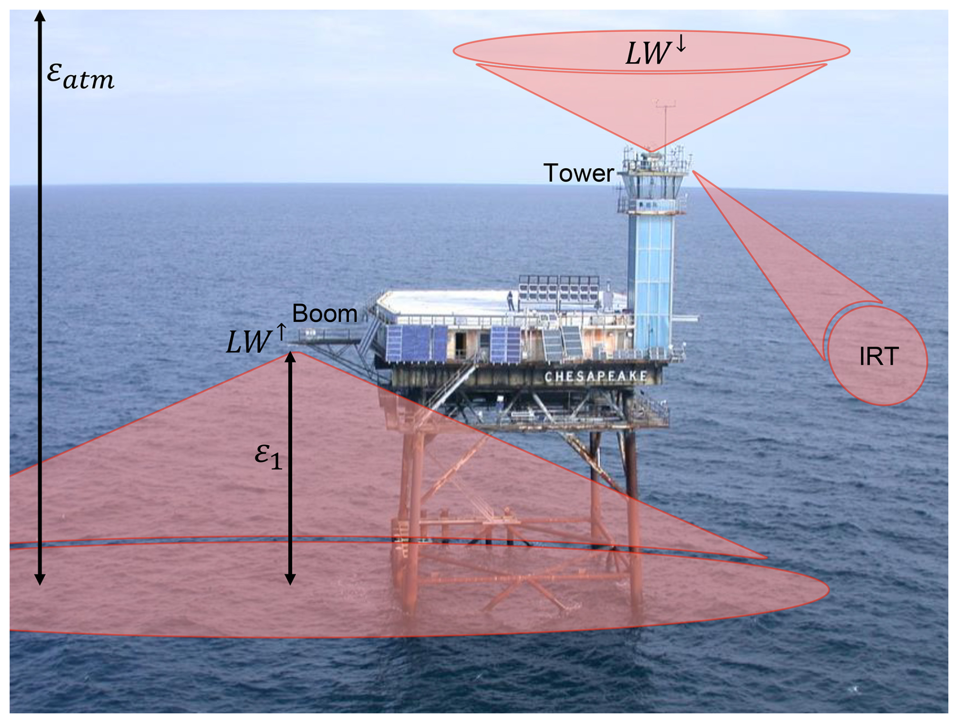 Figure 1Illustration of the instrument geometry at the Chesapeake Lighthouse. LW↑ flux measurements are located on an 8 m boom, which is not long enough to remove the structure from the FOV. LW↓ flux measurements have an unobstructed FOV at the top of the lighthouse structure tower. The Infrared Radiation Thermometer (IRT) provides sea surface temperature, and it has a narrow FOV that is unobstructed by the structure. The emissivities εatm and ε1 pertain to the atmospheric column and the layer of air below the boom.