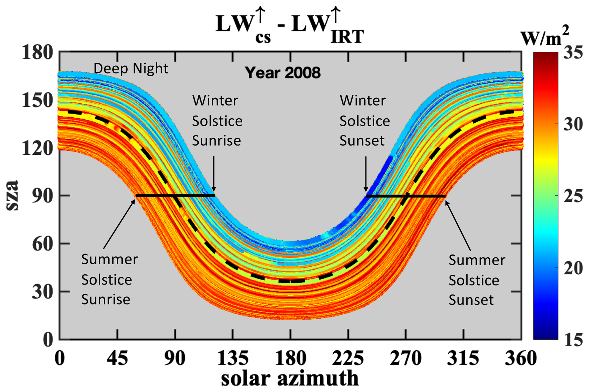 The LW↑ measurement problem at COVE is illustrated quantitatively in Fig. 3, which presents differences between wide FOV upwelling pyrgeometer data and narrow FOV IRT data as a function of the solar geometry for the year 2008. The datapoints are very small so that daily data appear as U-shaped “lines”. The highest solar zenith angles at solar noon (when solar azimuth equals 180°) occur during the winter months, so lines for the winter season appear at the top of the figure. Likewise, the summer season occupies the lowest lines. The black dashed line in the middle represents the equinoxes.