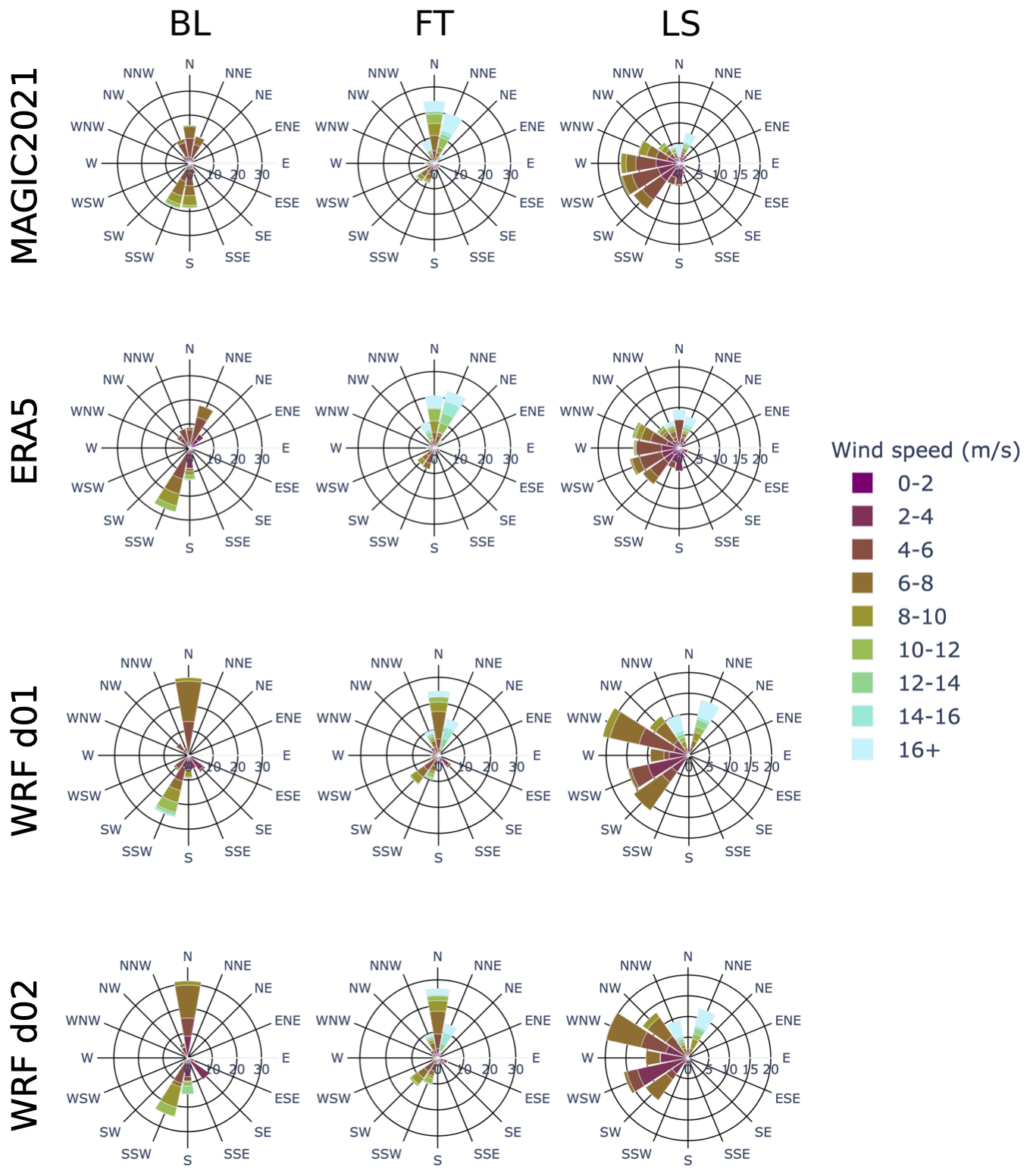 Figure 2Wind rose plots for MAGIC2021 observations as well as ERA5 and WRF simulations. The radial axis gives the proportion (in %) of wind coming from a given direction given by the angular axis. Coloured bins represent the share of speed ranges shown in the legend associated with each direction. Rows correspond to data products MAGIC2021 observations, ERA5, WRF d01 and WRF d02. Columns correspond to atmospheric layers: Boundary Layer (BL), Free Troposphere (FT) and Lower Stratosphere (LS), described in Sect. 2.3.2.