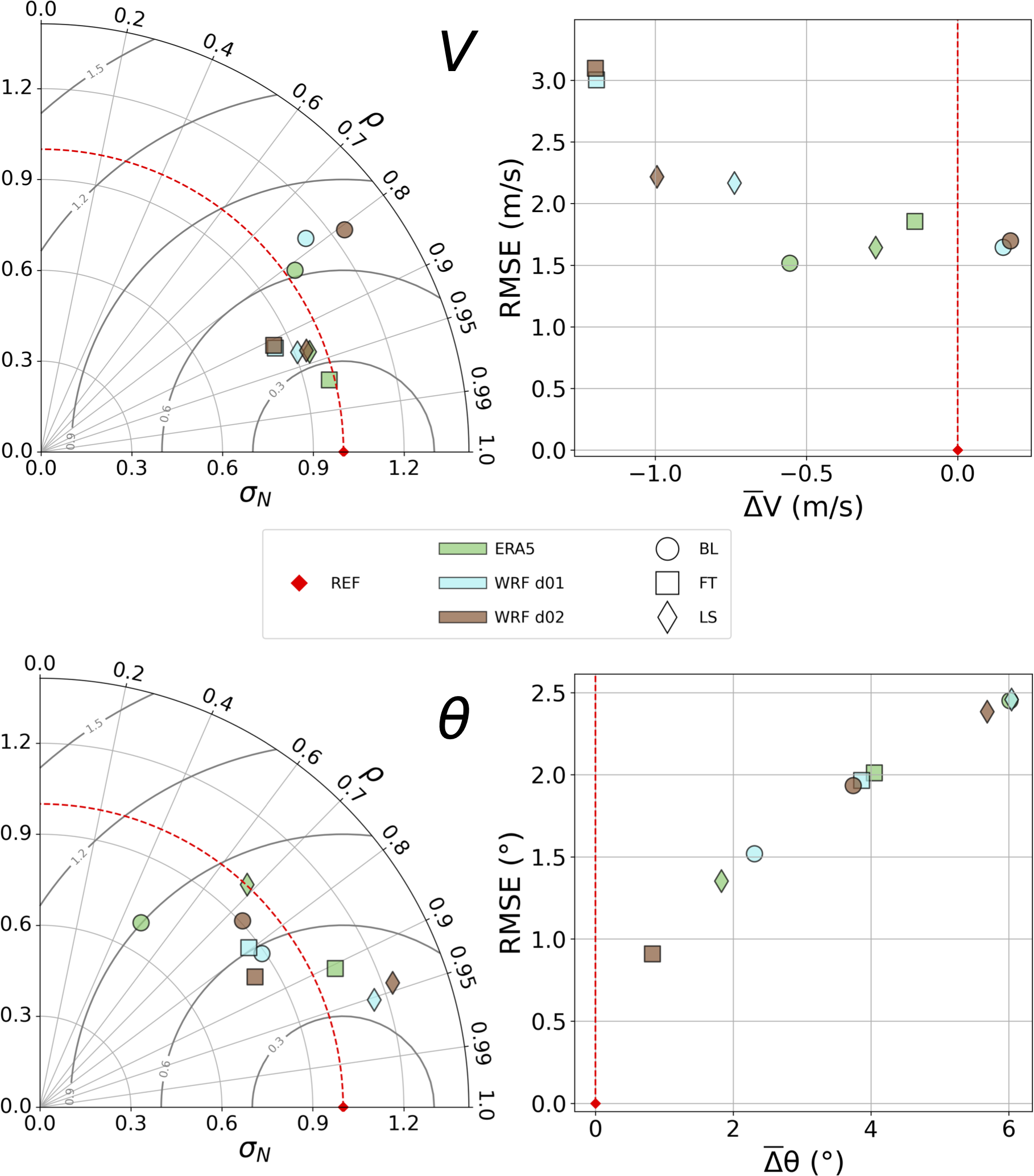 Figure 3Comparison between simulated and observed wind speed V (top) and direction θ (bottom) with Taylor (left) and bias () versus RMSE (right) diagrams. The radial axis of Taylor diagrams represents the normalised standard deviation of modelled wind speed/direction. The angular axis represents correlation between modelled and observed wind speed/direction. Centred RMSE is represented by the radial distance from the reference point. RMSE and bias are computed subtracting observed quantities to simulated quantities.