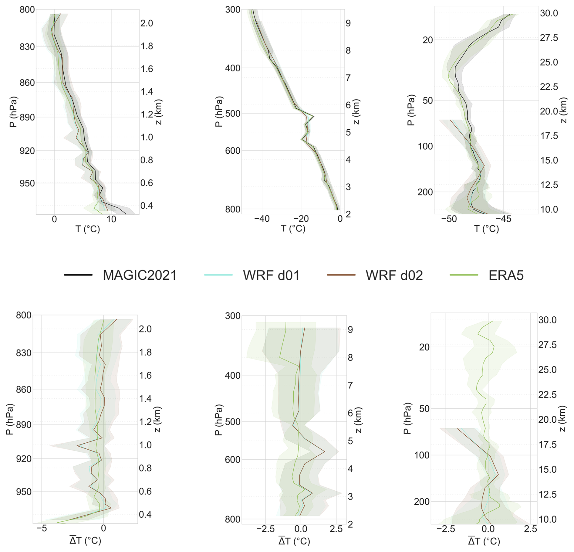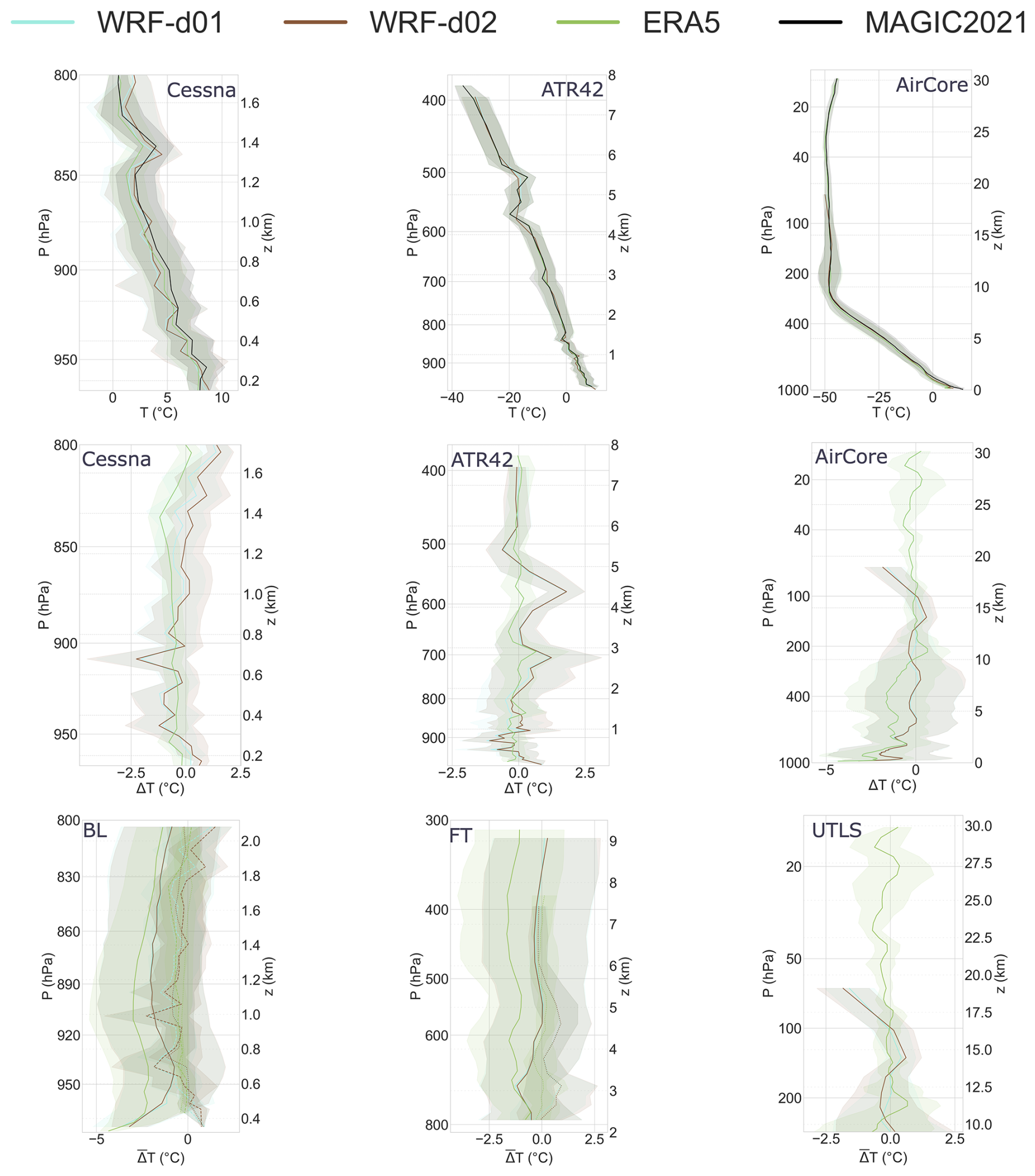 Figure 4Vertical temperature intercomparison between MAGIC2021 data and weather models. Observational data includes MAGIC2021 data from weather balloons, ATR42 and Cessna aircraft and was binned to fit model grids. Profiles are divided in three blocks (P>800, and P<300 hPa) which allow to illustrate results from our analysis layers (BL, FT and LS). Shaded areas represent the 1σ deviation from the mean temperature or temperature bias profiles, computed from binned data. Top: Mean temperature profiles computed accross all flights from MAGIC2021 platforms (black) plotted with mean interpolated temperature profiles from models corresponding to platform trajectories. Bottom: Bias profiles in the same pressure ranges. Bias is computed as the mean difference between interpolated model quantities and measured physical quantities over each bin.