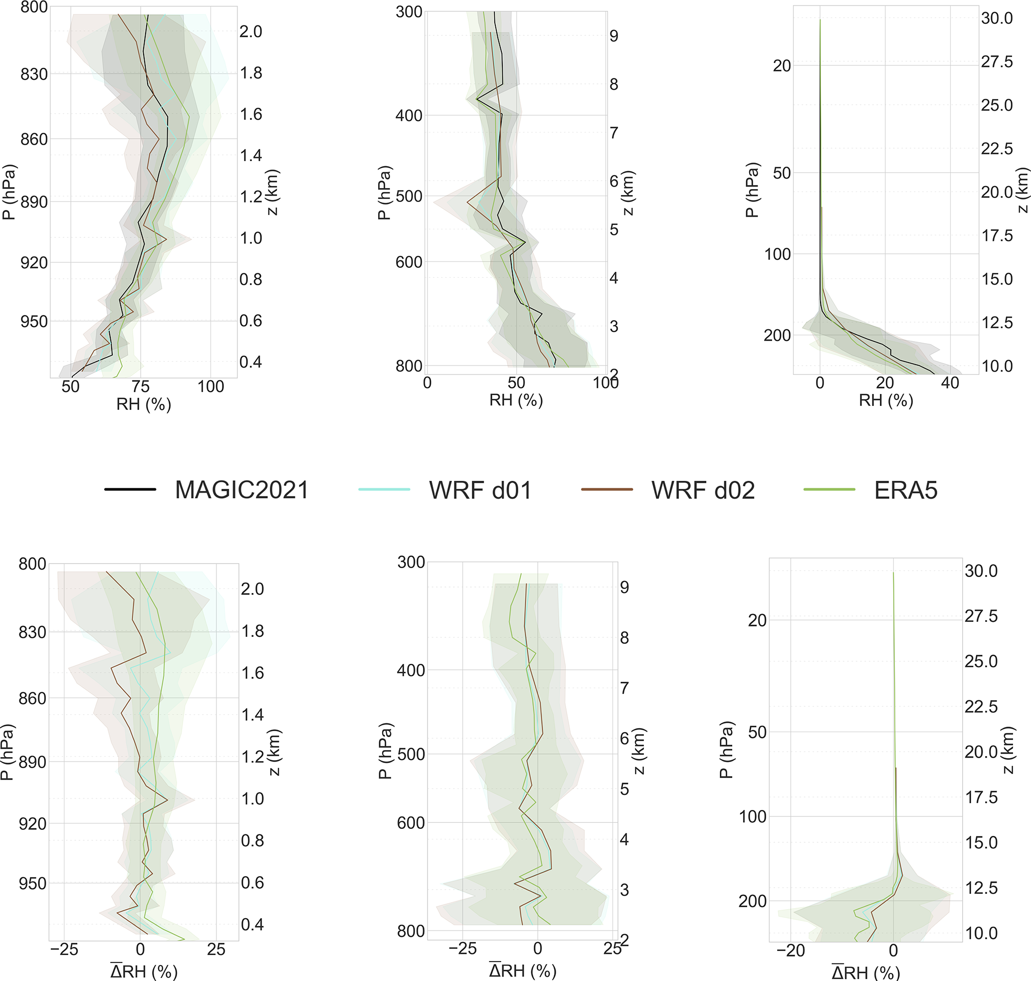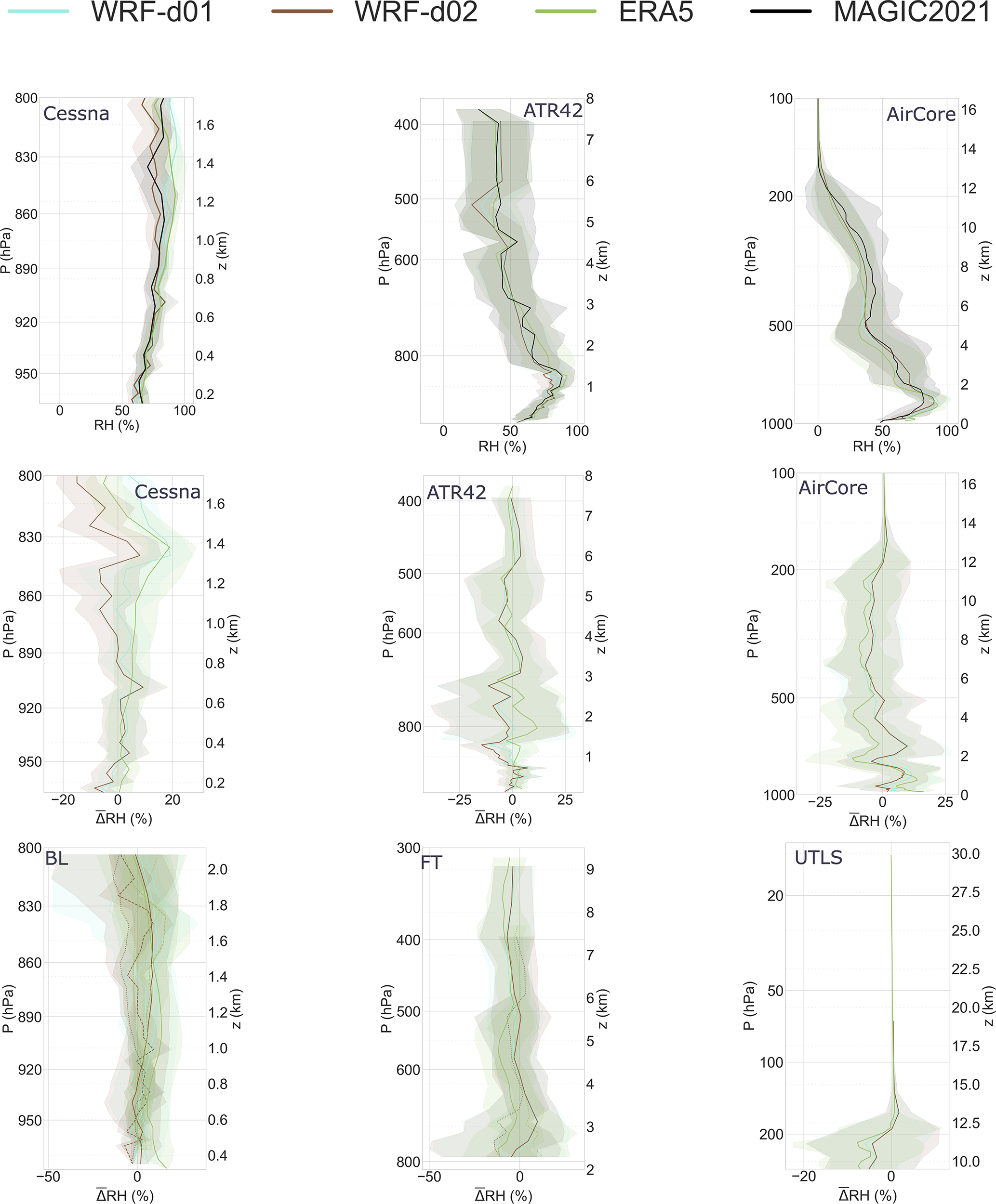 Figure 5Vertical relative humidity intercomparison between MAGIC2021 data and weather models. Observational data includes MAGIC2021 data from weather balloons, ATR42 and Cessna aircraft and was binned to fit model grids. Profiles are divided in three blocks (P>800, and P<300 hPa) which allow to illustrate results from our analysis layers (BL, FT, LS). Shaded areas represent the 1σ deviation from the mean RH or RH bias profiles, computed from binned data. Top: Mean RH profiles computed accross all flights from MAGIC2021 platforms (black) plotted with mean interpolated RH profiles from models corresponding to platform trajectories. Bottom: Bias profiles in the same pressure ranges. Bias is computed as the mean difference between interpolated model quantities and measured physical quantities over each bin.