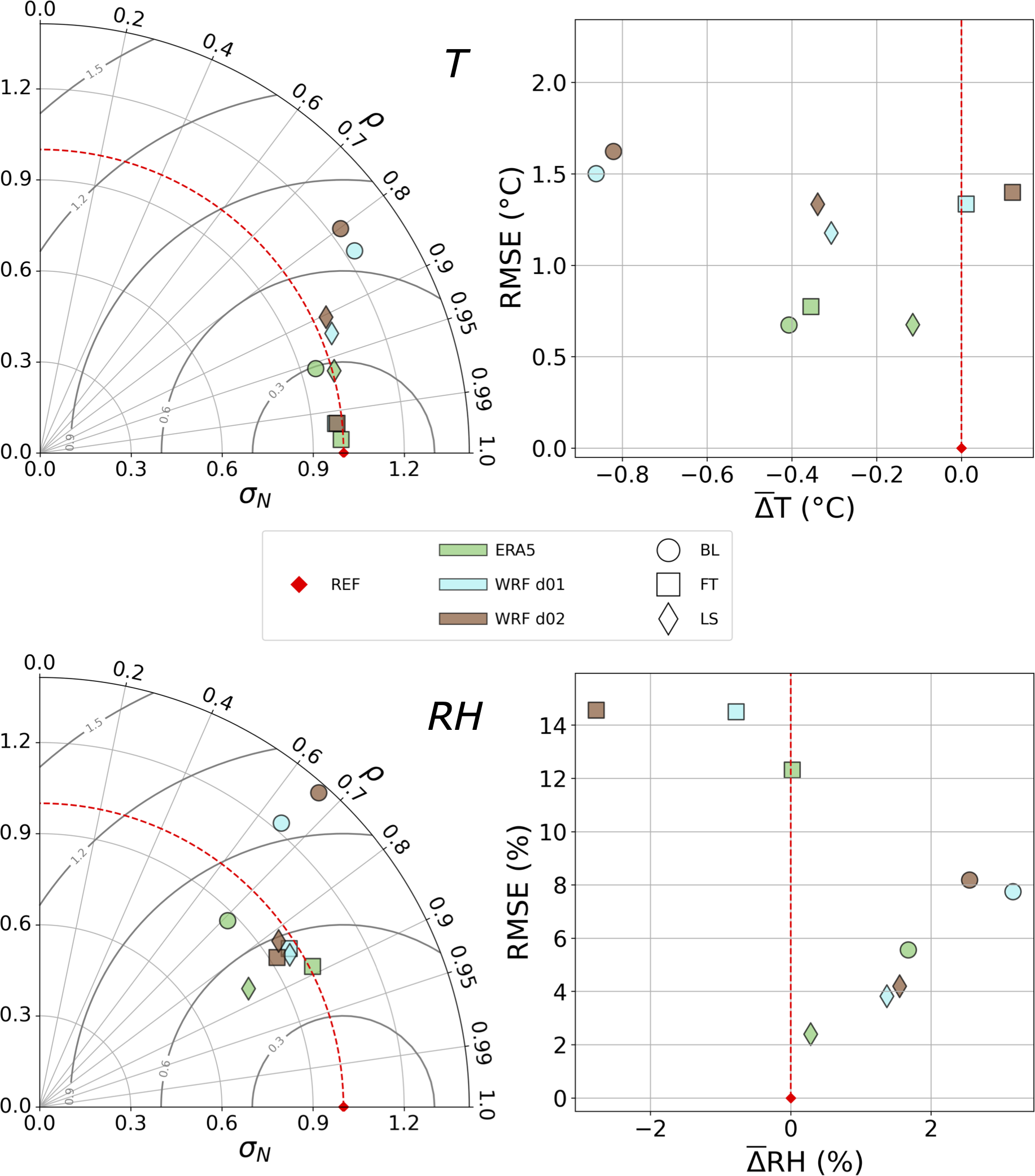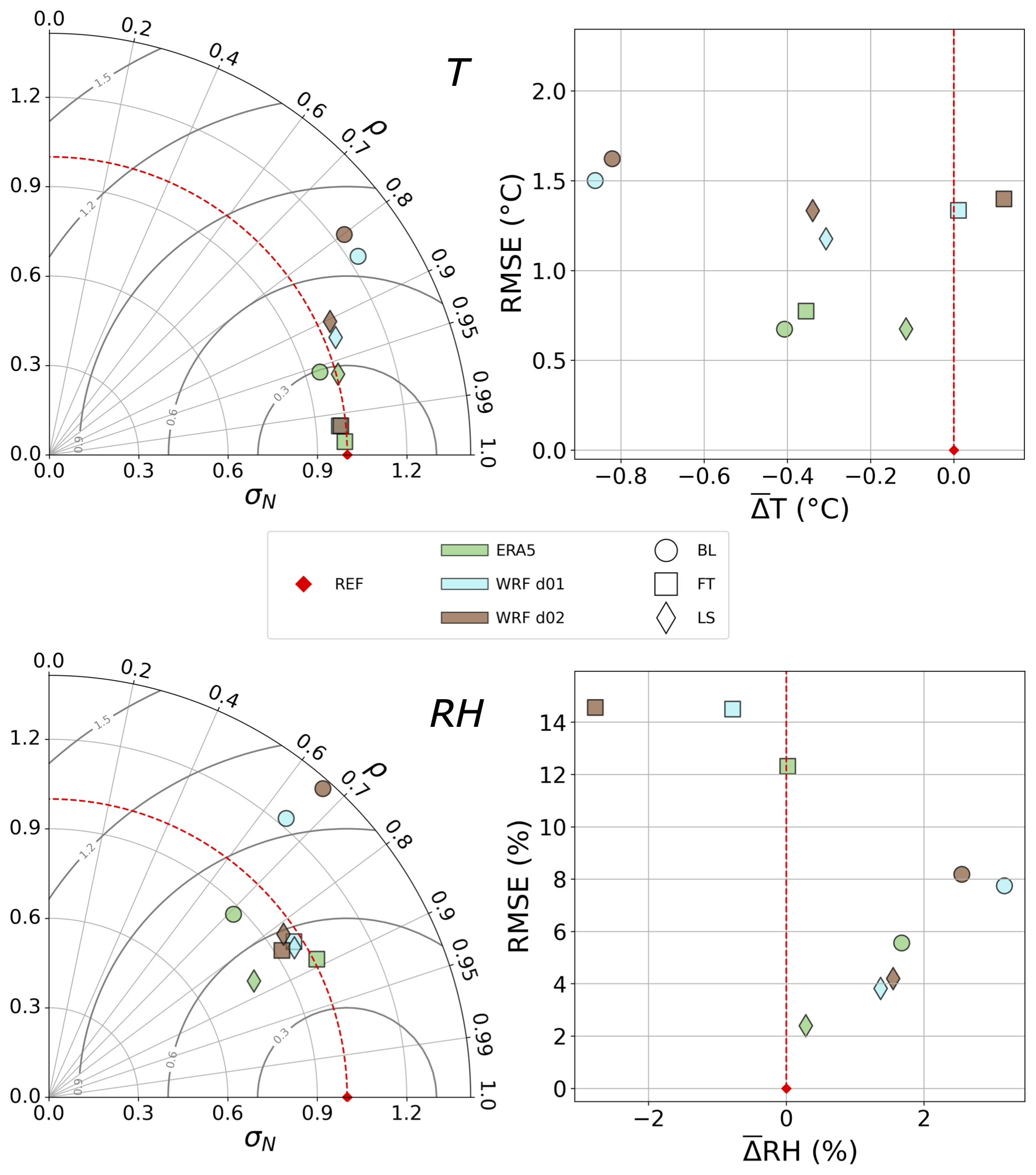 Figure 6 shows the statistical intercomparison with all models, metrics and atmospheric layers for both temperature and humidity (RH), the top panel focusing on temperature. It can be seen that all models performed very well in every layer, being all close to σN=1 and correlating very well with observations (ρ≥0.8). In terms of RMSE and , models also perform well, with RMSE <2 and °C in all layers. Models generally reproduce temperature best in the FT, followed by the LS, and then the BL across most statistical categories.