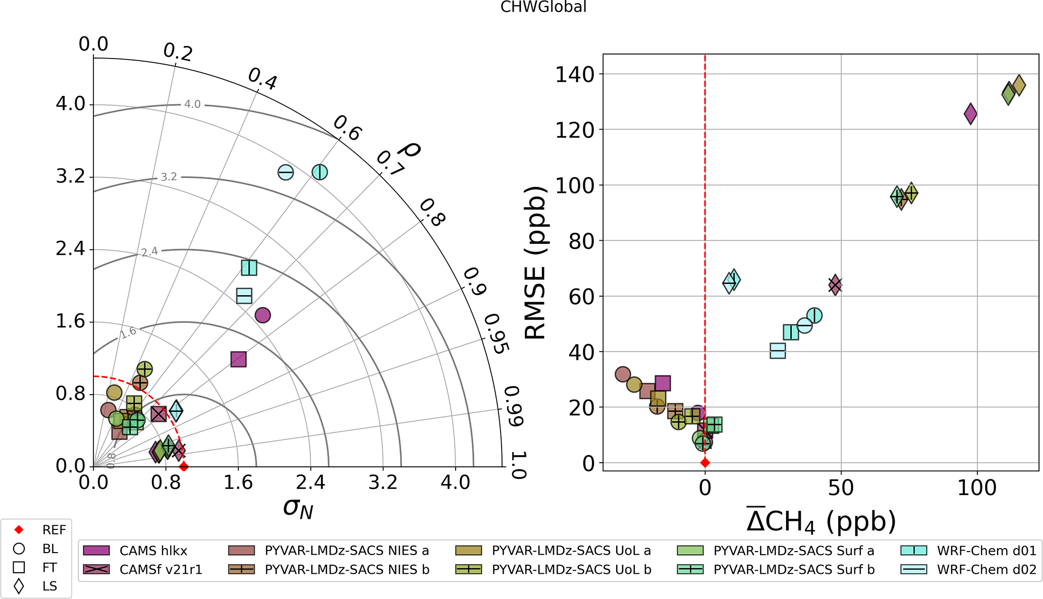 Figure 8Left: Taylor diagram for CH4 comparisons between MAGIC2021 observations and ERA5 model. The radial axis represents the normalised standard deviation of the modelled CH4. The angular axis represents the correlation between modelled and observed CH4. The centred RMSE is represented by the radial distance from the reference point. Right: RMSE against bias (CH4) computed from MAGIC2021 observations and modelled CH4. RMSE and bias are computed subtracting observed quantities to simulated quantities.
