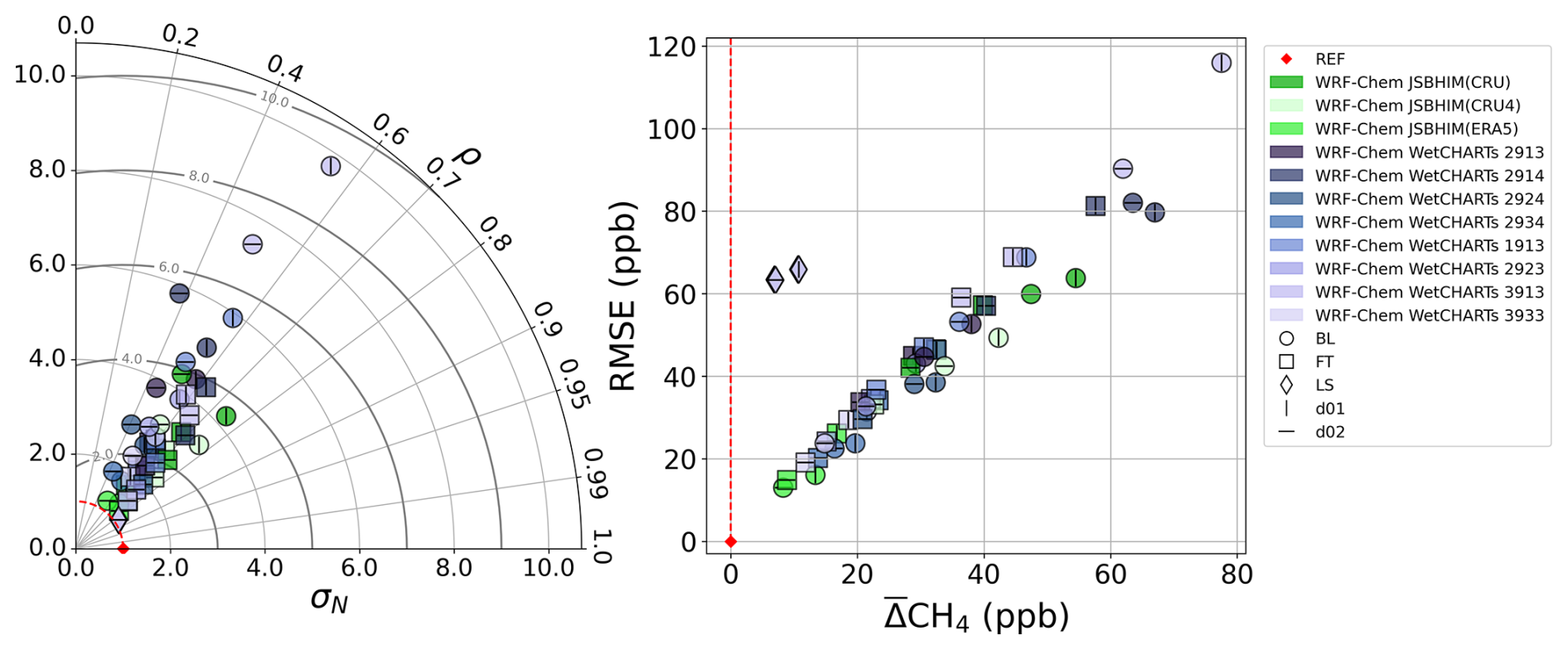 We first start by discussing BL positive biases observed in regional WRF-Chem CH4 products. WRF-Chem d01 and d02 results presented in Figs. 7 and 8 are an average over eleven different products for each of d01 and d02 domains. As such, individual products had differing performance scores in the four metrics of the study. To investigate results from regional simulations in more depth, we show results from individual WRF-Chem products in Fig. 9. This figure shows the same 4-metric assessment as in Fig. 8, but it focuses on individual WRF-Chem simulations, which differ by their input CH4 emissions from wetlands. WRF-Chem d02 products performed better than d01 in most layers and statistical metrics (ρ performance was inventory dependent and very close between d01 and d02). For all products, the assessment showed that mixing ratios were positively biased in the BL and the FT, with a stronger bias in the BL. Most global model products showed a negative bias in the BL () and an underestimate of variability (), contrary to WRF-Chem mixing ratios which showed both a positive bias and an overestimate of variability. This is consistent with an understimate/overstimate of surface emissions as weak sources would both lead to a negative and a decrease in variability, whilst overestimated surface emissions would lead to both a positive and an overstimated variability of boundary layer mixing ratios. This could also be explained by vertical transport issues (e.g. an underestimation of the BL height) in WRF, which could have participated in producing higher CH4 mixing ratios in the BL. However, the consistency between WRF-Chem simulations and MAGIC2021 data in the FT implies that the vertical transport representation in WRF-Chem was accurate, thus indicating that CH4 overestimates in the BL from WRF-Chem products was more likely stemming from wetland emission models. This was further confirmed by the relative scale of input emissions shown in Table 1, which correlates with the relative scale of CH4 overestimates in the BL shown in Fig. 9. Moreover, the particular WRF-Chem set-up used in this study has been used in previous studies without showing any issues with BL or FT transport (Lauvaux et al., 2012, 2016). Thus we deduced that inventories overestimated the magnitude of wetland emissions (which could also lead to overestimating flux variability).