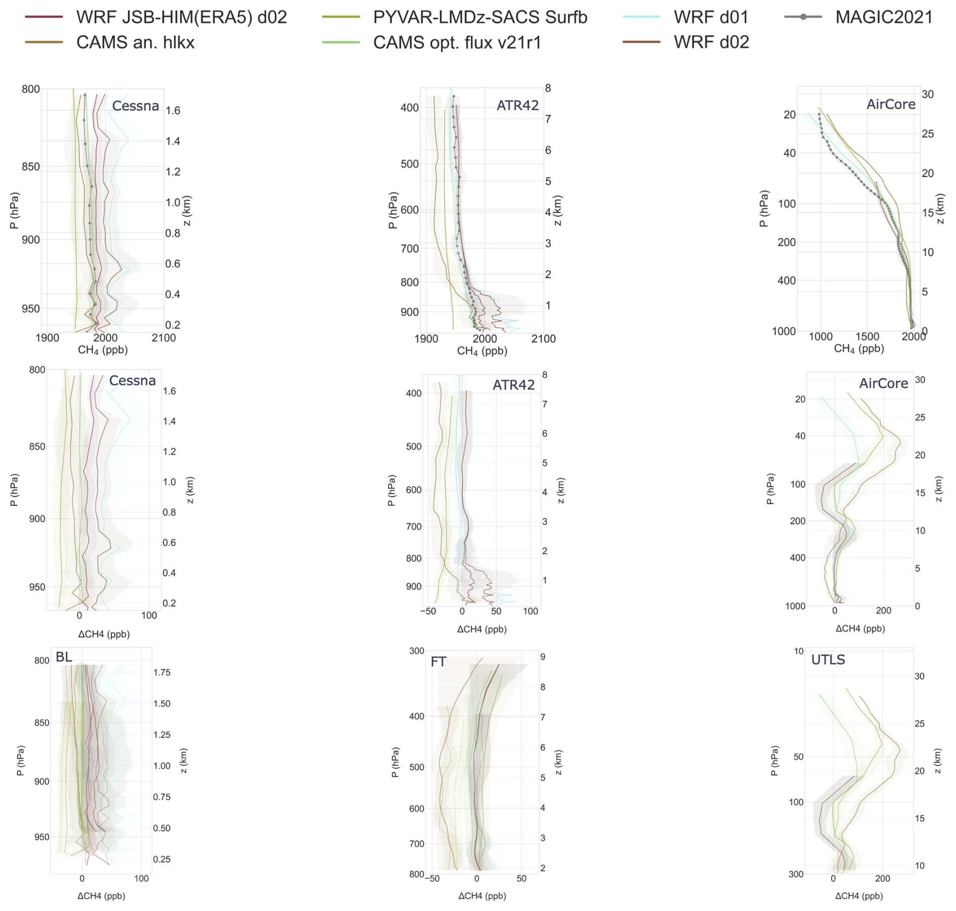 Figure 7Vertical methane intercomparison between MAGIC2021 data and chemistry-transport models. Observational data include MAGIC2021 samples from AirCores, ATR42 and Cessna aircraft and were binned to fit model grids. Profiles are divided in three blocks (P>800, and P<300 hPa) which allow to illustrate results from our analysis layers (BL, FT, LS). Shaded areas represent the 1σ deviation from the mean CH4 or CH4 bias profiles, computed from binned data. Top: Mean CH4 profiles computed accross all flights from MAGIC2021 platforms (black) plotted with mean interpolated CH4 profiles from models corresponding to platform trajectories. Bottom: Bias profiles in the same pressure ranges. Bias is computed as the mean difference between interpolated model quantities and measured physical quantities over each bin.