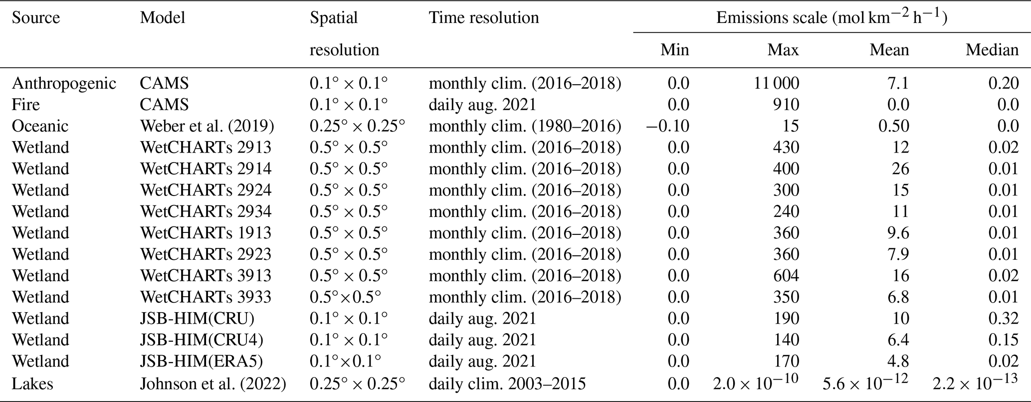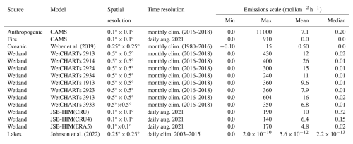 Oceanic methane emissions were taken from Weber et al. (2019), a monthly climatology with a spatial resolution of 0.25°×0.25°. Methane lake emissions from Johnson et al. (2022) were also used. The dataset includes corrections for daily and seasonal observational bias, observed ice-free/emission seasonality, and realistic lake area and distribution. Anthropogenic and fire emissions of methane were provided by CAMS, which publishes emissions driving their global atmospheric greenhouse gas mixing ratios products (Agustí-Panareda et al., 2023). They are respectively from EDGARv4.2FT2010 (Olivier and Janssens-Maenhout, 2012) and GFAS Version 1.2 (Kaiser et al., 2012). Anthropogenic and fire emissions both share the same 0.1°×0.1° spatial resolution but anthropogenic emissions were monthly averaged emissions over 2016–2017–2018 (latest years available) whereas fire emissions were daily emissions from August 2021. Wetland emissions came from two sources: the latest product from the WetCHARTs model (Bloom et al., 2017), with simulations up to 2019, and several versions of JSBACH-HIMMELI (JSB-HIM) simulations originally designed for the European project VERIFY, described in Aalto (2019), that were recently extended to later years. WetCHARTs has a spatial resolution of 0.5°×0.5° and a monthly time resolution, spanning until 2019. A monthly climatological average was therefore used, taking the same years as for CAMS anthropogenic emissions. 18 different flux versions are publicly available from WetCHARTs, depending on physical parameters detailed in the documentation (Bloom et al., 2017). A subset of 8 WetCHARTs versions were selected, to maximise representativeness of the dataset whilst staying cost-effective in our computations. JSB-HIM emissions were provided by the Finnish Meteorological Institute (FMI) at daily resolution for August 2021 and a spatial resolution of 0.1°×0.1°. 3 versions of total wetland flux from JSB-HIM, each differing in their driving meteorology were included in this study.